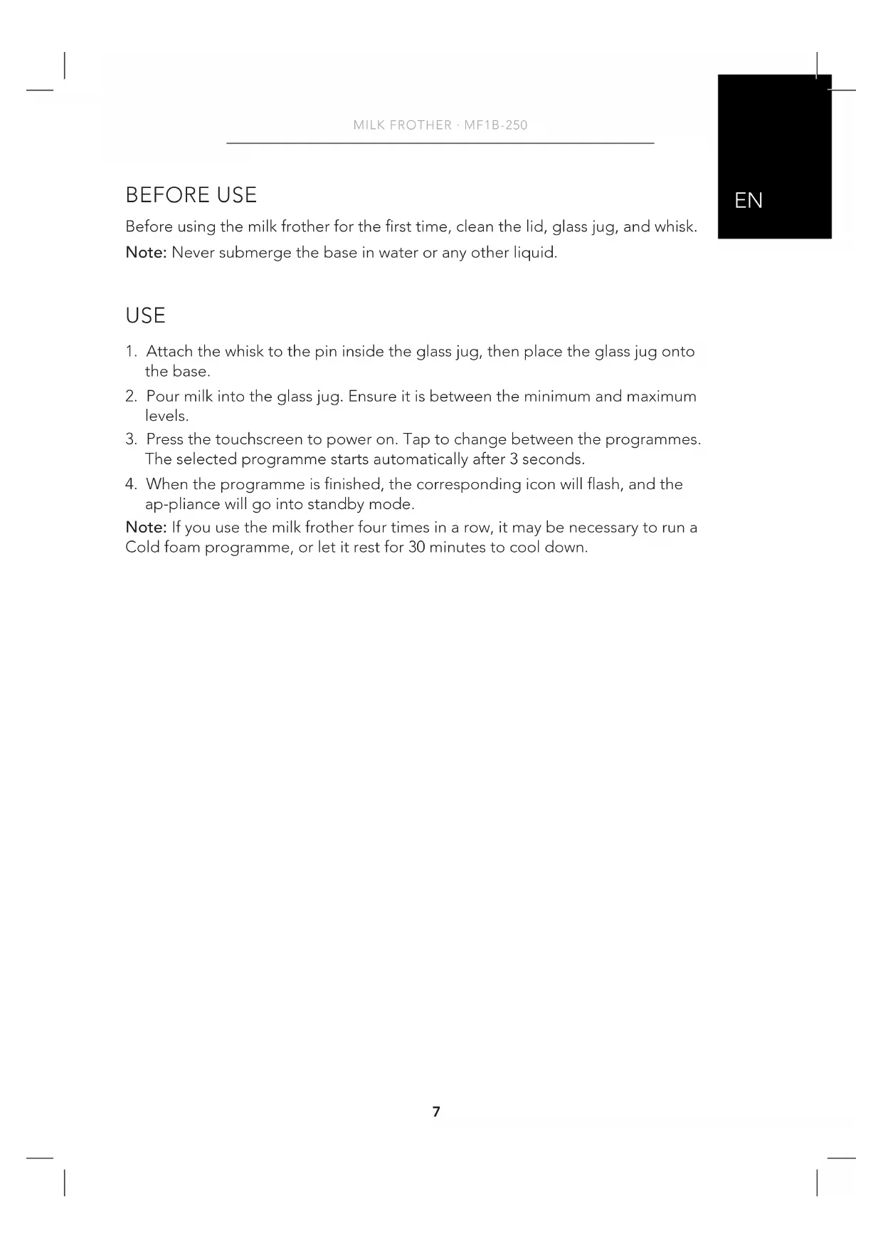 ap-pliance will go into standby mode. Note: If you use the milk frother four times in a row, it may be necessary to run a Cold foam programme, or let it rest for 30 minutes to cool down.8