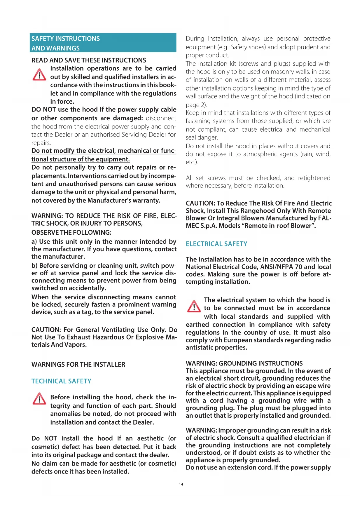 TECHNICAL SAFETY Before installing the hood, check the in- tegrity and function of each part. Should anomalies be noted, do not proceed with installation and contact the Dealer. Do NOT install the hood if an aesthetic (or cosmetic) defect has been detected. Put it back into its original package and contact the dealer. No claim can be made for aesthetic (or cosmetic) defects once it has been installed. During installation, always use personal protective equipment (e.g.: Safety shoes) and adopt prudent and proper conduct. The installation kit (screws and plugs) supplied with the hood is only to be used on masonry walls: in case of installation on walls of a different material, assess other installation options keeping in mind the type of wall surface and the weight of the hood (indicated on page 2). Keep in mind that installations with different types of fastening systems from those supplied, or which are not compliant, can cause electrical and mechanical seal danger. Do not install the hood in places without covers and do not expose it to atmospheric agents (rain, wind, etc.). All set screws must be checked, and retightened where necessary, before installation. CAUTION: To Reduce The Risk Of Fire And Electric Shock, Install This Rangehood Only With Remote Blower Or Integral Blowers Manufactured by FAL- MEC S.p.A. Models “Remote in-roof Blower”. ELECTRICAL SAFETY The installation has to be in accordance with the National Electrical Code, ANSI/NFPA 70 and local codes. Making sure the power is o before at- tempting installation. The electrical system to which the hood is to be connected must be in accordance with local standards and supplied with earthed connection in compliance with safety regulations in the country of use. It must also comply with European standards regarding radio antistatic properties.