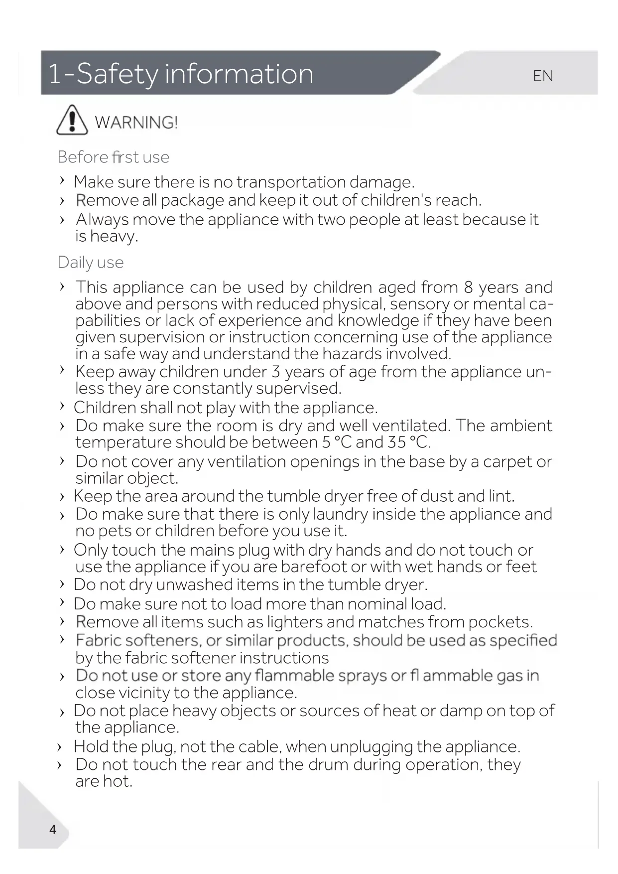 Before rst use Make sure there is no transportation damage. .hcaer s 'nerdlihc fo tuo ti peek dna egakcap lla evome ti esuaceb tsael ta elpoep owt htiw ecnailppa eht evom syawl A is heavy. Daily use This appliance can be used by children aged from 8 years and above and persons with reduced physical, sensory or mental ca- pabilities or lack of experience and knowledge if they have been given supervision or instruction concerning use of the appliance in a safe way and understand the hazards involved. Keep away children under 3 years of age from the appliance un- less they are constantly supervised. Children shall not play with the appliance. Do make sure the room is dry and well ventilated. The ambient temperature should be between 5 °C and 35 °C. Do not cover any ventilation openings in the base by a carpet or similar object. Keep the area around the tumble dryer free of dust and lint. Do make sure that there is only laundry inside the appliance and no pets or children before you use it. Only touch the mains plug with dry hands and do not touch or use the appliance if you are barefoot or with wet hands or feet Do not dry unwashed items in the tumble dryer. Do make sure not to load more than nominal load. emove all items such as lighters and matches from pockets. by the fabric softener instructions close vicinity to the appliance. Do not place heavy objects or sources of heat or damp on top of the appliance. Hold the plug, not the cable, when unplugging the appliance. Do not touch the rear and the drum during operation, they are hot.
