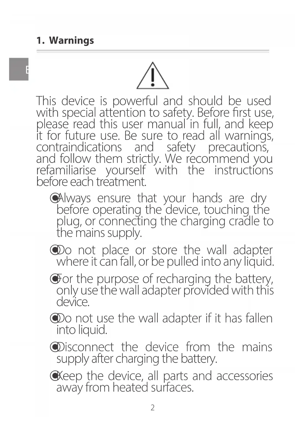 This device is powerful and should be used with special attention to safety. Before rst use, please read this user manual in full, and keep it for future use. Be sure to read all warnings, contraindications and safety precautions, and follow them strictly. We recommend you refamiliarise yourself with the instructions before each treatment.