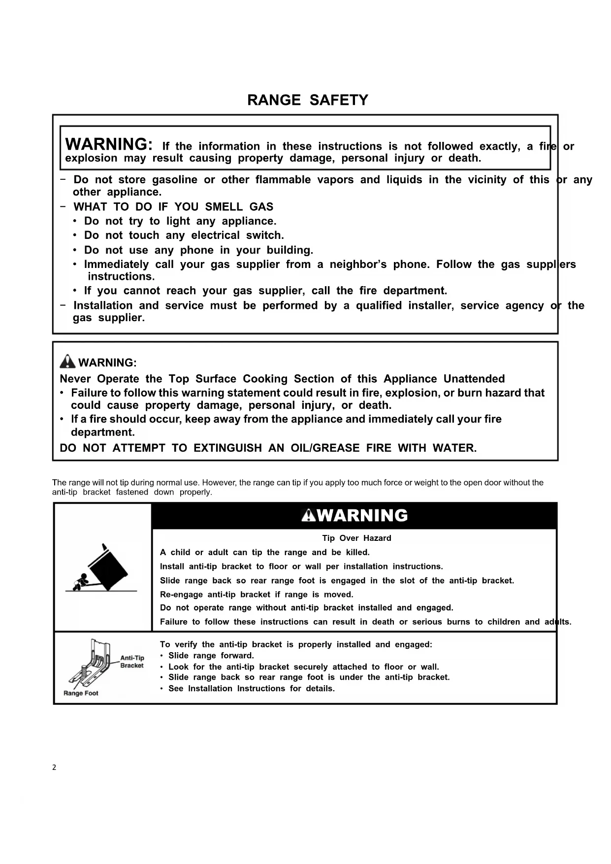 - If a fire should occur, keep away from the appliance and immediately call your fire department. DO NOT ATTEMPT TO EXTINGUISH AN OIL/GREASE FIRE WITH WATER. The range will not tip during normal use. However, the range can tip if you apply too much force or weight to the open door without the anti-tip bracket fastened down properly. WARNING Tip Over Hazard A child or adult can tip the range and be killed. Install anti-tip bracket to floor or wall per installation instructions. Slide range back so rear range foot is engaged in the slot of the anti-tip bracket. Re-engage anti-tip bracket if range is moved. Do not operate range without anti-tip bracket installed and engaged. Failure to follow these instructions can result in death or serious burns to children and adults. To verify the anti-tip bracket is properly installed and engaged: