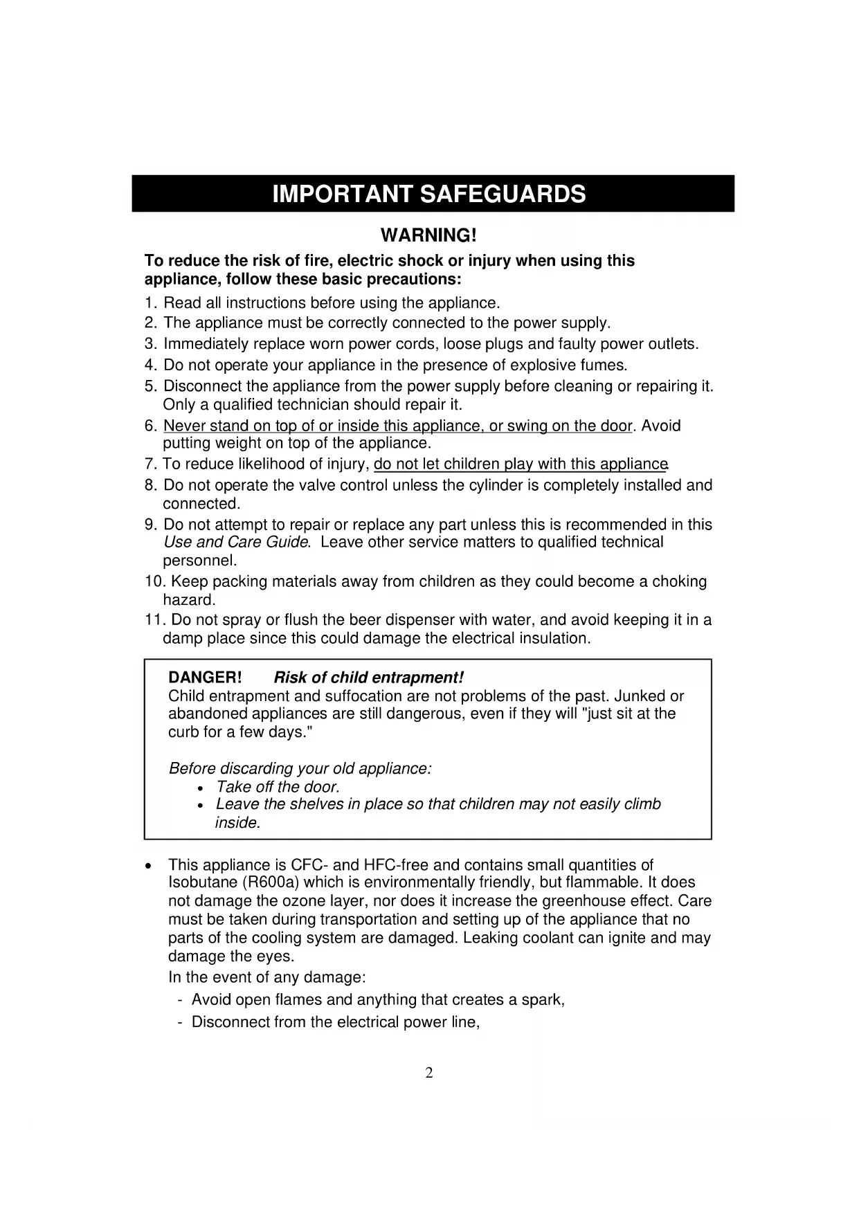 regulator and gauge. The tank pressure must always be higher than the pressure used on the keg. Always apply pressure to the keg before drawing beer.17 Beer has off taste: Often bitter and bite-y; sometimes completely lacking flavor and zest. It may also have an oily or foul odor which may carry an unpleasant taste. Improper cleaning of the tap Brush and clean the tap properly. It should be scoured using a detergent, then rinsed clean. Contaminated air line Beer tube should be examined. If contaminated, it should be replaced. Condensation is forming on the tap. It is normal to see conden- sation forming on the tap. It is caused by a difference in temperature between the cold beer and the surfaces of the tap when beer is flowing through the line. Beer that is left in the tap is not cooled by the beer dispenser. After a period of non-use, a few ounces should be drained before drinking.18 GENERAL TROUBLESHOOTING If there is a problem with the beer dispenser itself, see if you can find it listed in the chart below. You may be able to save yourself the cost of a service visit. Problem Possible Cause The beer dispenser doesn’t work. Power supply not firmly connected. Supplied voltage is too low. Tripped circuit breaker or blown fuse. The machine switches on and off frequently. Indoor temperature is higher than usual. Machine door is opened frequently. Door is not completely closed. Temperature control is not set correctly. Door cannot be closed properly. Beer keg not properly placed. Beer dispenser is not level. Door was reversed and re-installed incorrectly. Metal plate or beer kegs are out of place. Noise Rushing noise may be the sound of refrigerant flow, which is normal. As each cycle ends, the gurgle of refrigerant flow may be heard. Contraction and expansion of inner wall may cause pops and crackles.19 LIMITED WARRANTY
