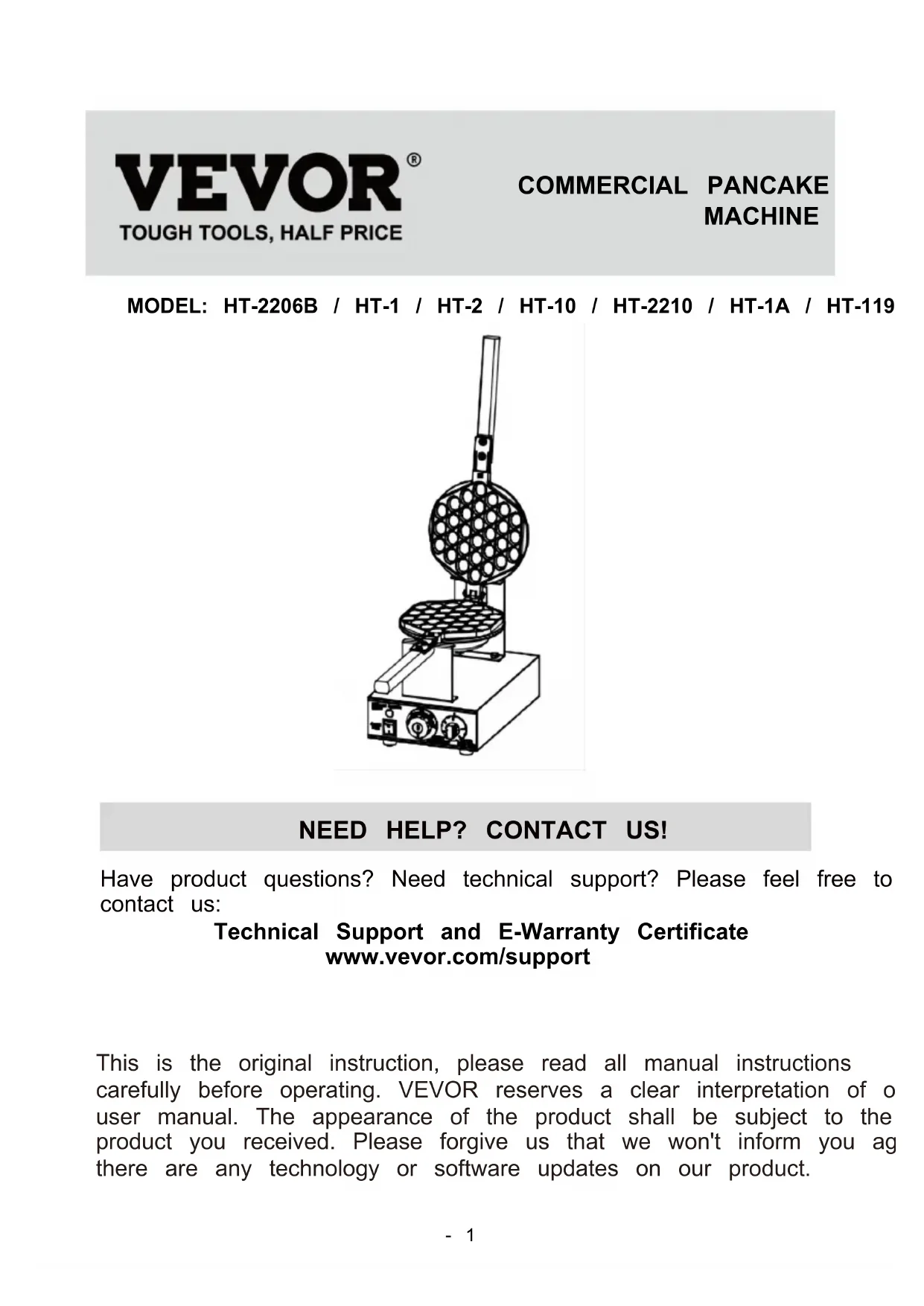 HT-2210 / HT-1A / HT-119 We continue to be committed to provide you tools with competitive price. "Save Half", "Half Price" or any other similar expressions used by us only represents an estimate of savings you might benefit from buying certain tools with us compared to the major top brands and does not necessarily mean to cover all categories of tools offered by us. You are kindly reminded to verify carefully when you are placing an order with us if you are actually saving half in comparison with the top major brands.- 1 - MODEL: HT-2206B / HT-1 / HT-2 / HT-10 / HT-2210 / HT-1A / HT-119 NEED HELP? CONTACT US! Have product questions? Need technical support? Please feel free to contact us: Technical Support and E-Warranty Certificate www.vevor.com/support This is the original instruction, please read all manual instructions carefully before operating. VEVOR reserves a clear interpretation of our user manual. The appearance of the product shall be subject to the product you received. Please forgive us that we won't inform you again if there are any technology or software updates on our product. COMMERCIAL PANCAKE MACHINE- 2 - Warning-To reduce the risk of injury, user must read instructions manual carefully. Indoor use only. Pay attention to high temperatures to prevent burns. CORRECT DISPOSAL This product is subject to the provision of European Directive 2012/19/EC. The symbol showing a wheelie bin crossed through indicates that the product requires separate refuse collection in the European Union. This applies to the product and all accessories marked with this symbol. Products marked as such may not be discarded with normal domestic waste, but must be taken to a collection point for recycling electrical and electronic devices Compliance is a EC & UK security certification.