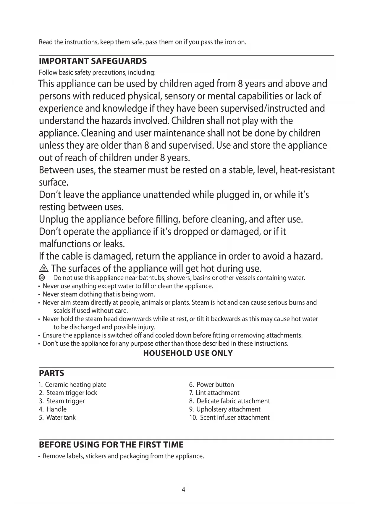 AE4 Read the instructions, keep them safe, pass them on if you pass the iron on. IMPORTANT SAFEGUARDS Follow basic safety precautions, including: This appliance can be used by children aged from 8 years and above and persons with reduced physical, sensory or mental capabilities or lack of experience and knowledge if they have been supervised/instructed and understand the hazards involved. Children shall not play with the appliance. Cleaning and user maintenance shall not be done by children unless they are older than 8 and supervised. Use and store the appliance out of reach of children under 8 years. Between uses, the steamer must be rested on a stable, level, heat-resistant surface. Don’t leave the appliance unattended while plugged in, or while it’s resting between uses. Unplug the appliance before lling, before cleaning, and after use. Don’t operate the appliance if it’s dropped or damaged, or if it malfunctions or leaks. If the cable is damaged, return the appliance in order to avoid a hazard.