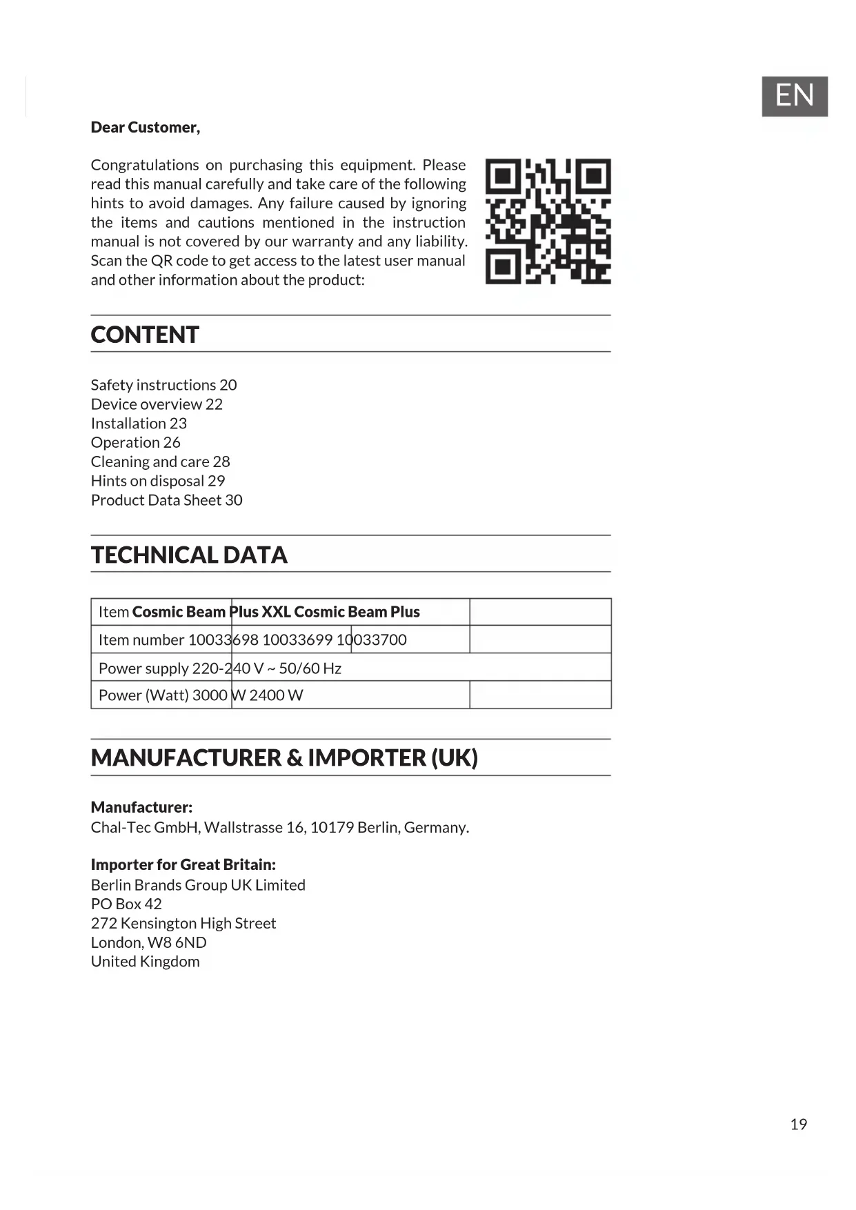 Dear Customer, Congratulations on purchasing this equipment. Please read this manual carefully and take care of the following hints to avoid damages. Any failure caused by ignoring the items and cautions mentioned in the instruction manual is not covered by our warranty and any liability. Scan the QR code to get access to the latest user manual and other information about the product: CONTENT TECHNICAL DATA Item Cosmic Beam Plus XXL Cosmic Beam Plus Item number 10033698 10033699 10033700 Power supply 220-240 V ~ 50/60 Hz Power (Watt) 3000 W 2400 W MANUFACTURER & IMPORTER (UK) Manufacturer: Chal-Tec GmbH, Wallstrasse 16, 10179 Berlin, Germany. Importer for Great Britain: Berlin Brands Group UK Limited PO Box 42 272 Kensington High Street London, W8 6ND United Kingdom Safety instructions20 Device overview22 Installation23 Operation26 Cleaning and care28 Hints on disposal29 Product Data Sheet3020