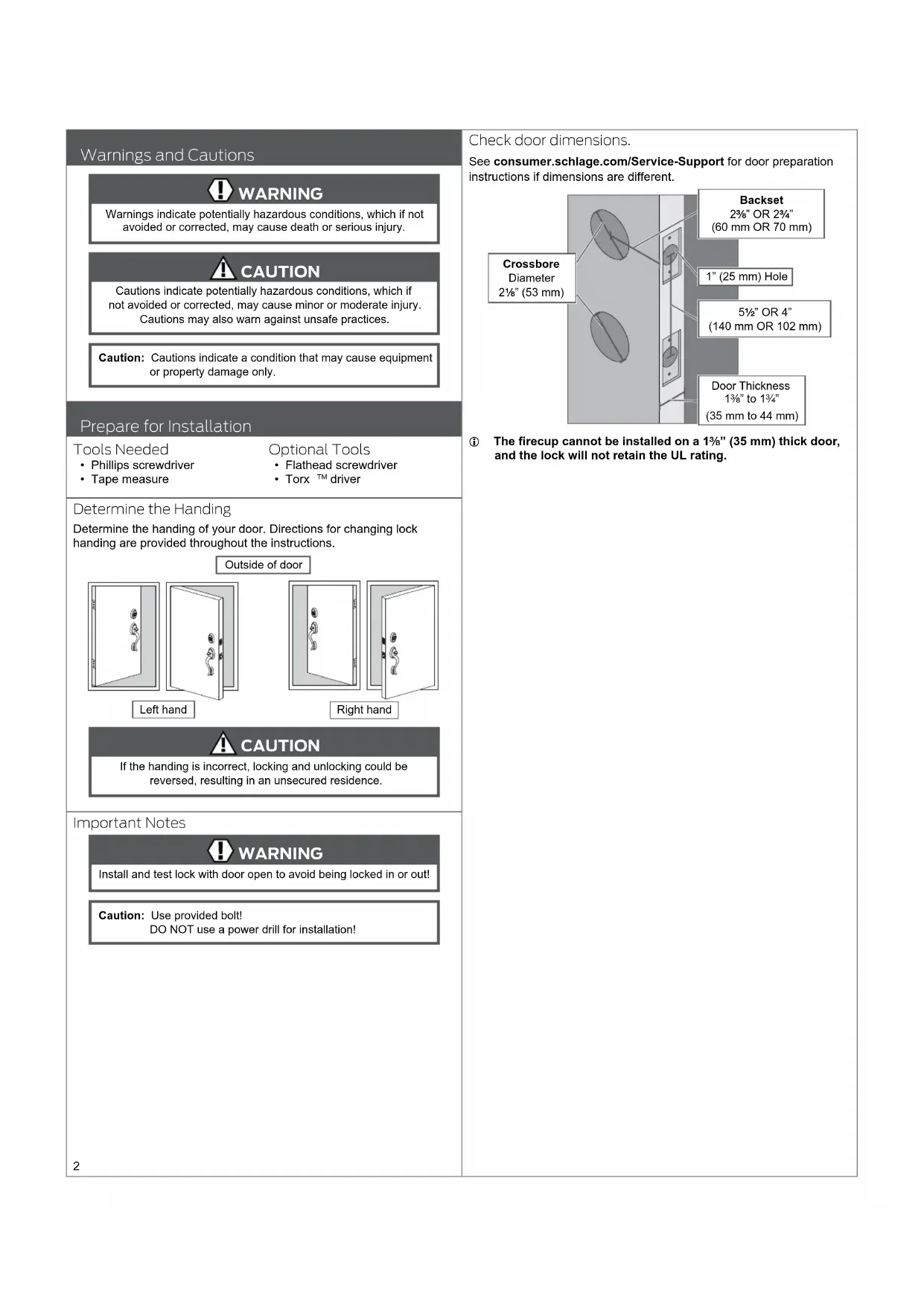 driver Determine the Handing Determine the handing of your door. Directions for changing lock handing are provided throughout the instructions. Left hand Right hand Outside of door CAUTION If the handing is incorrect, locking and unlocking could be reversed, resulting in an unsecured residence. Important Notes WARNING Install and test lock with door open to avoid being locked in or out! Caution: Use provided bolt! DO NOT use a power drill for installation! Check door dimensions. See consumer.schlage.com/Service-Support for door preparation instructions if dimensions are different. Backset 2C\,” OR 2C\v” (60 mm OR 70 mm) 5Z\x” OR 4” (140 mm OR 102 mm) Door Thickness 1C\,” to 1C\v” (35 mm to 44 mm) Crossbore Diameter 2Z\,” (53 mm) 1” (25 mm) Hole L The recup cannot be installed on a 1C\,” (35 mm) thick door, and the lock will not retain the UL rating.3 Install the Lock 1 Install the bolt and latch. Caution: Use provided bolt! 1a Adjust bolt length, if necessary. Measure the backset. 2C\,” (60 mm) 2C\v” (70 mm) If the measurement is 2C\v” (70 mm), extend the bolt. Twist the faceplate.Make sure the button pops into place. 1b If desired, change to the square-corner faceplate.