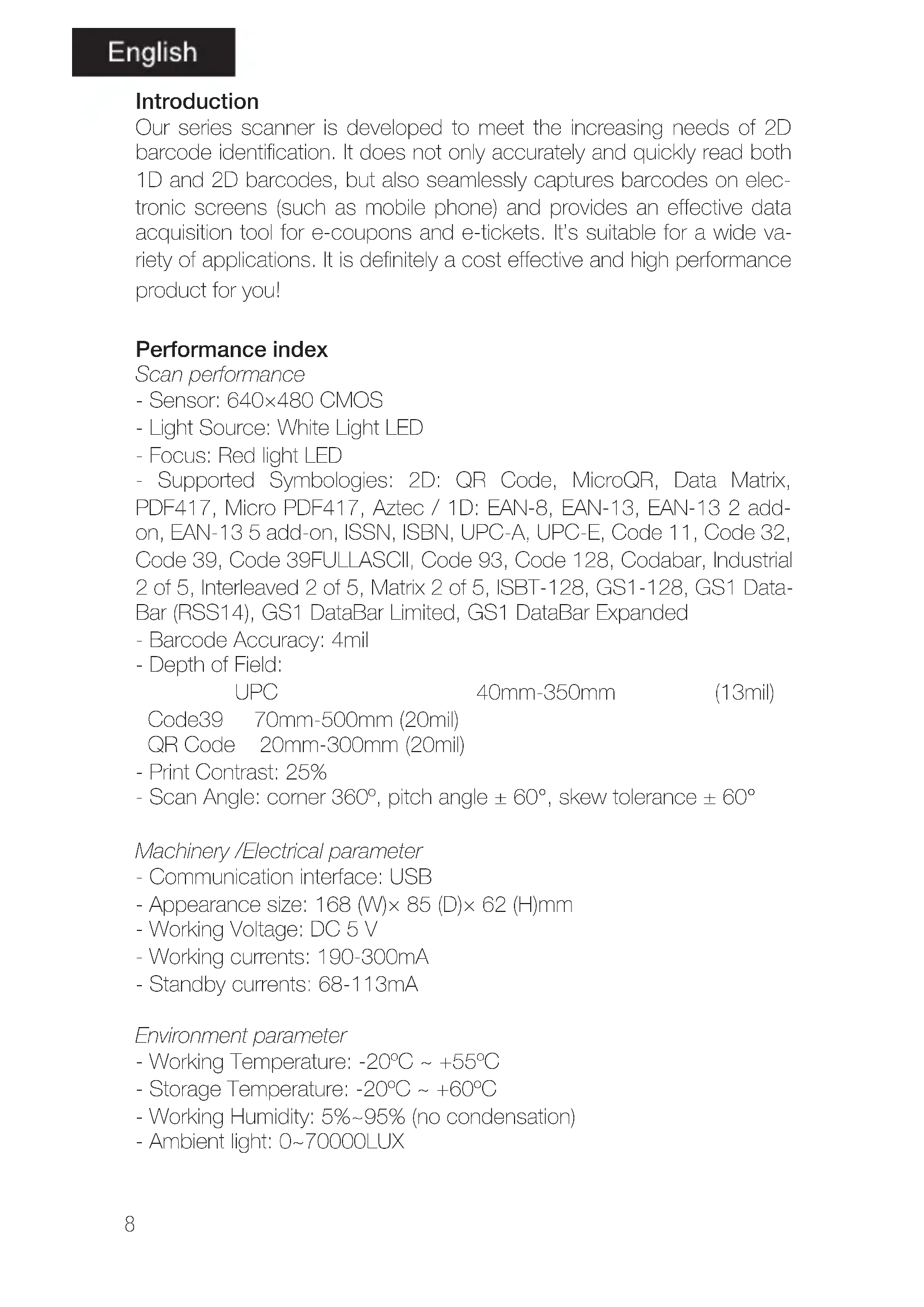 Manual Scanning Mode (Default) Enable Automatic Recognition Mode GS Control character substitution (Enable character escape first) Not replaced Replace with Ç *The output character “Ç” must enable virtual keyboard first13 Replace with | Replace with ^] Replace with ] Replace with <GS> Prefix No Prefix Prefix as STX Suffix No Suffix Add Enter Add Tab Add Enter+Tab Add ETX Beeper volume Volume low Volume high (Default)14 Beeper-good read Enable Beep After Good Read Disable Beep After Good Read (Default) Beeper tone-good read Low Tone Medium Tone (Default) High Tone USB keyboard text-transform Normal output (Default) Case reversal All Caps Lower case Keyboard layout setting English (United States) French (France) Italian (Italy) Italian 142 (Italy)15 German (Germany) Spanish (Spain) Spanish (Latin America) Greek (MS) Finnish Japanese