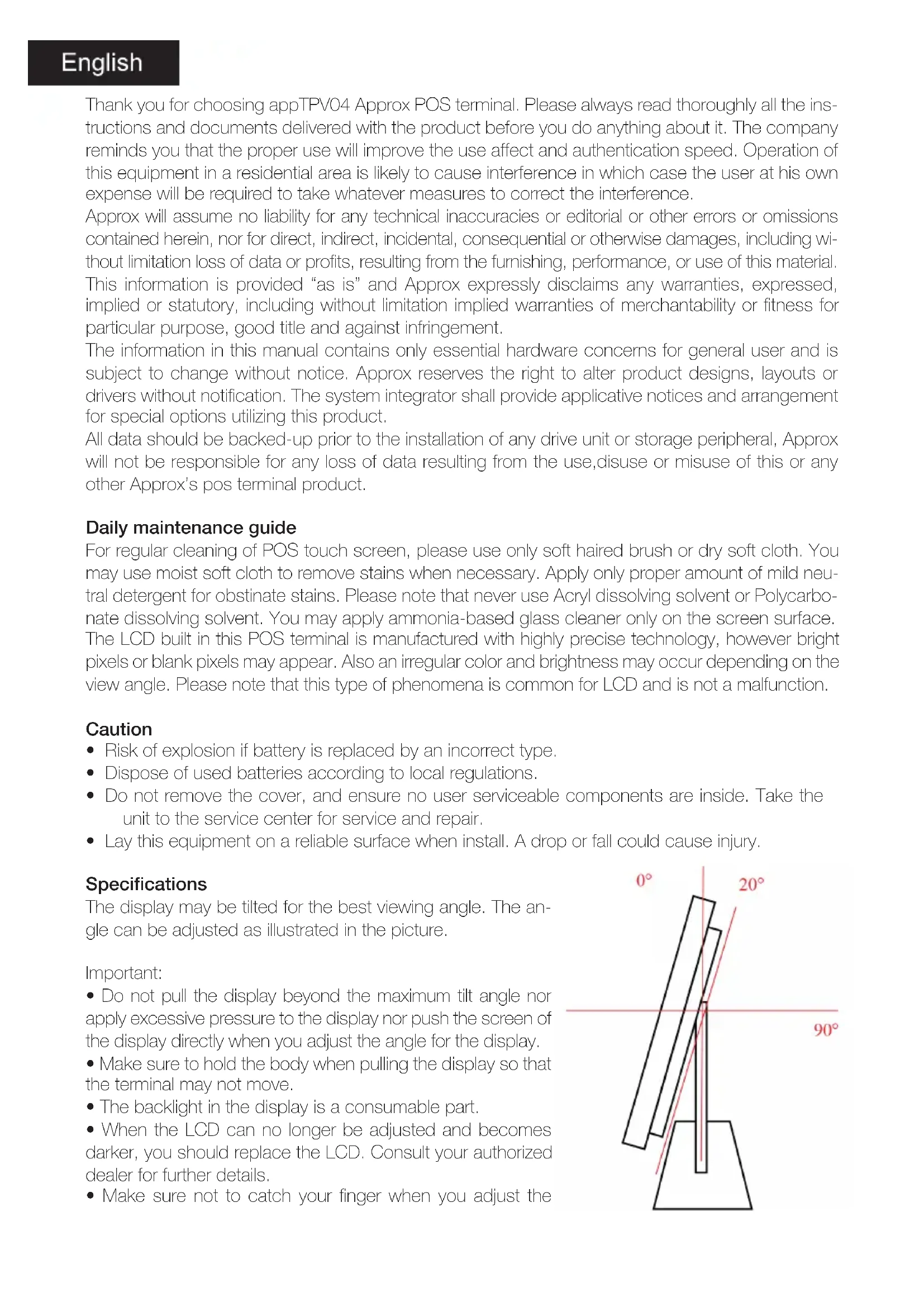 Thank you for choosing appTPV04 Approx POS terminal. Please always read thoroughly all the instructions and documents delivered with the product before you do anything about it. The company reminds you that the proper use will improve the use affect and authentication speed. Operation of this equipment in a residential area is likely to cause interference in which case the user at his own expense will be required to take whatever measures to correct the interference.