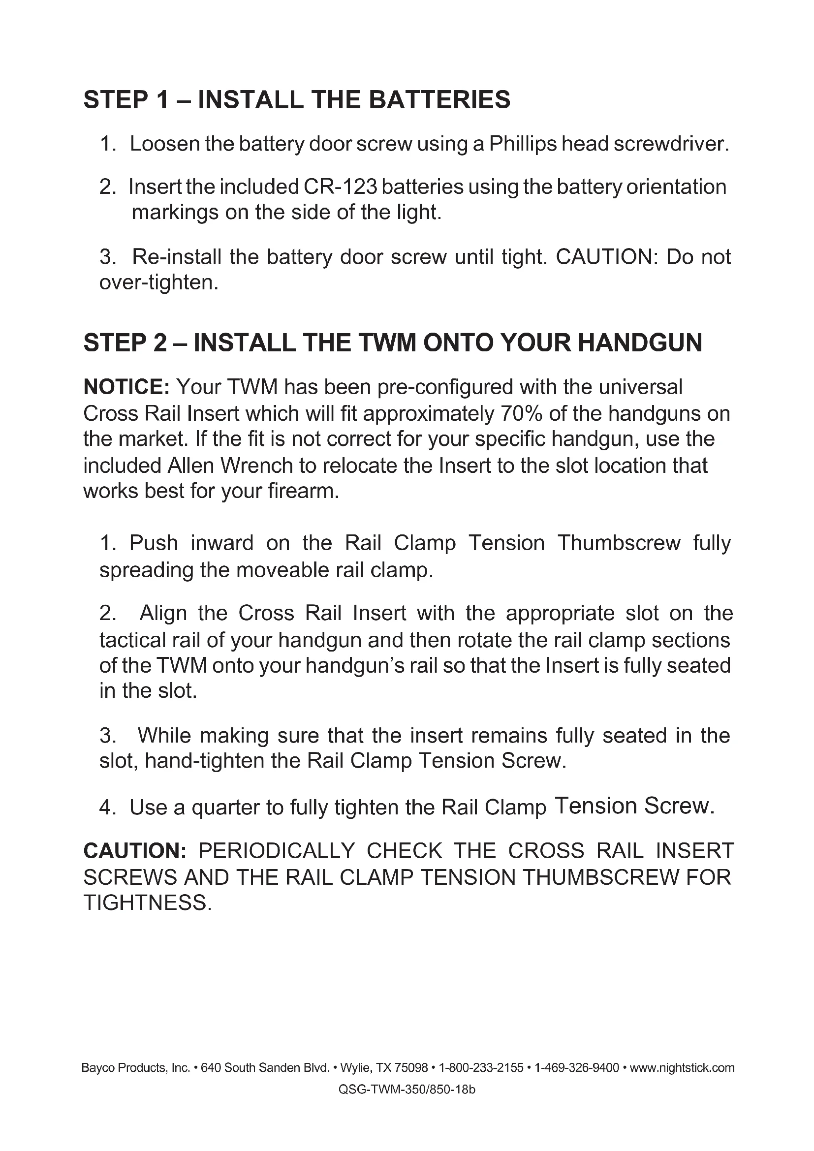 AND SERIOUS INJURY, DAMAGE TO PROPERTY, OR DEATH. y Thoroughly practice (employing safe training conditions) with the TWM and an unloaded rearm before using the weapon.Bayco Products, Inc. • 640 South Sanden Blvd. • Wylie, TX 75098 • 1-800-233-2155 • 1-469-326-9400 • www.nightstick.comINS-TWM-350/850-18b Image 7 Image 8 y While holding the TWM tightly to the tactical rail of your rearm, fully tighten by hand the Rail Clamp Tension Thumbscrew. (Image 7) y Then use a large coin (a quarter works well) and fully tighten the Rail Clamp Tension Thumbscrew. (Image 8)WARNING: NIGHTSTICK STRONGLY RECOMMENDS PERIODICALLY CHECKING TO INSURE THAT THE CROSS RAIL INSERT SCREWS AND THE RAIL CLAMP TENSION THUMBSCREW REMAIN TIGHT. FAILURE TO KEEP THESE TIGHT CAN RESULT IN DAMAGE TO THE TWM AND/OR THE CROSS RAIL INSERTS UNDER CONTINUOUS RECOIL.