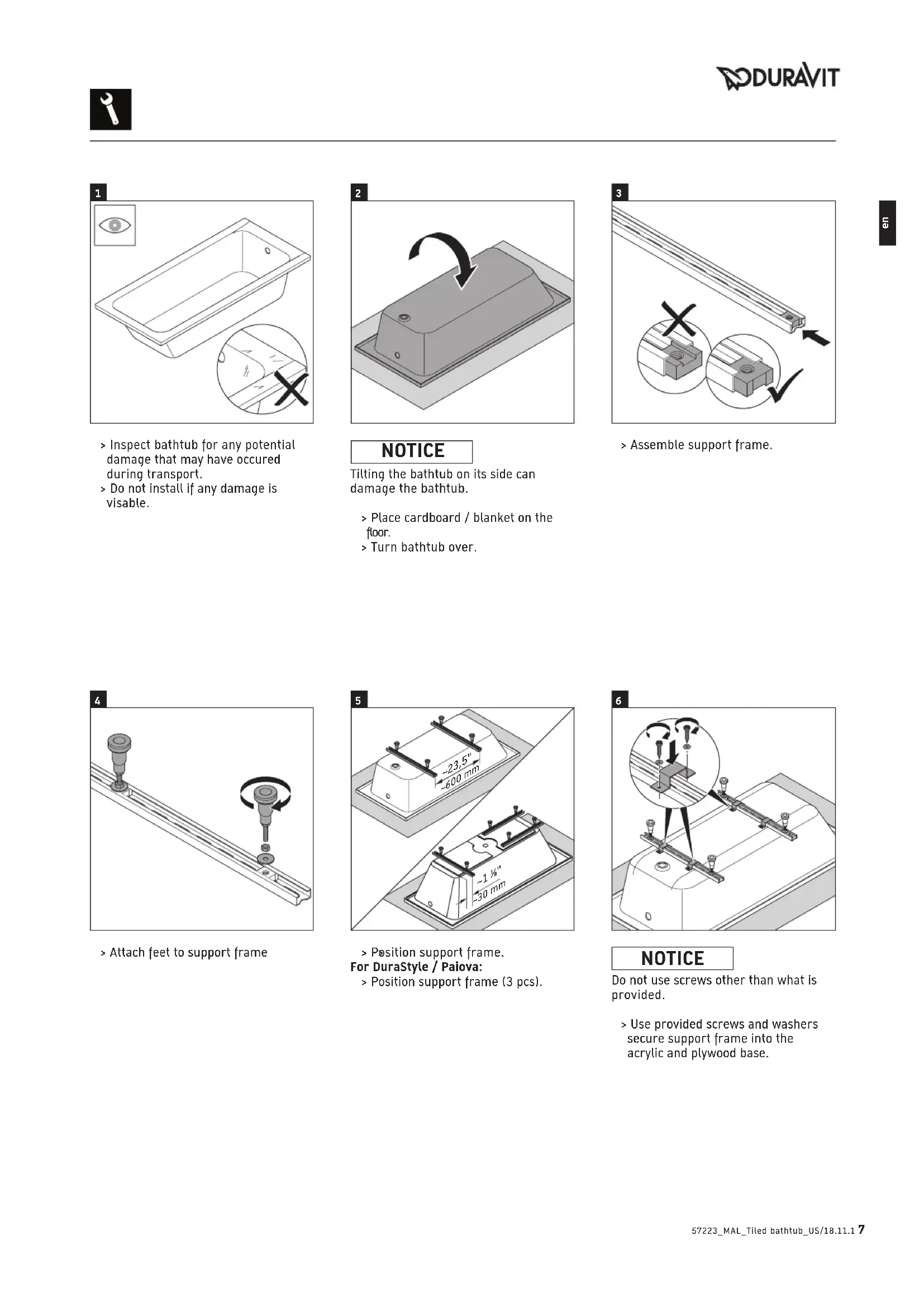 NOTICE Do not use screws other than what is provided. > Use provided screws and washers secure support frame into the acrylic and plywood base. > Position support frame. For DuraStyle / Paiova: > Position support frame (3 pcs). > Attach feet to support frame > Assemble support frame. NOTICE Tilting the bathtub on its side can damage the bathtub. > Place cardboard / blanket on the floor. > Turn bathtub over. > Inspect bathtub for any potential damage that may have occured during transport. > Do not install if any damage is visable. 57223_MAL_Tiled bathtub_US/18.11.1 7