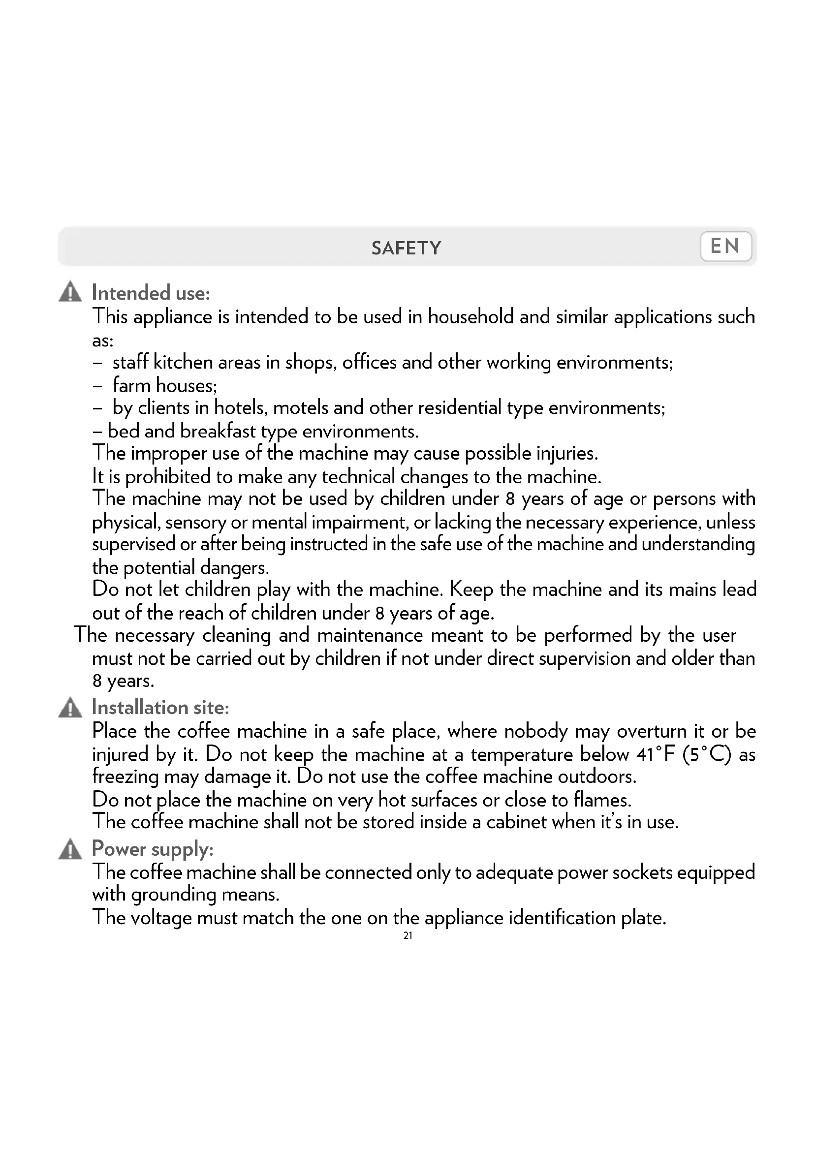 SAFETY Intended use: This appliance is intended to be used in household and similar applications such as: – staff kitchen areas in shops, offices and other working environments; – farm houses; – by clients in hotels, motels and other residential type environments; – bed and breakfast type environments. The improper use of the machine may cause possible injuries. It is prohibited to make any technical changes to the machine. The machine may not be used by children under 8 years of age or persons with physical, sensory or mental impairment, or lacking the necessary experience, unless supervised or after being instructed in the safe use of the machine and understanding the potential dangers. Do not let children play with the machine. Keep the machine and its mains lead out of the reach of children under 8 years of age. The necessary cleaning and maintenance meant to be performed by the user must not be carried out by children if not under direct supervision and older than 8 years. Installation site: Place the coffee machine in a safe place, where nobody may overturn it or be injured by it. Do not keep the machine at a temperature below 41°F (5°C) as freezing may damage it. Do not use the coffee machine outdoors. Do not place the machine on very hot surfaces or close to flames. The coffee machine shall not be stored inside a cabinet when it’s in use. Power supply: The coffee machine shall be connected only to adequate power sockets equipped with grounding means. The voltage must match the one on the appliance identification plate.22 ITEN SAFETY Power supply cable