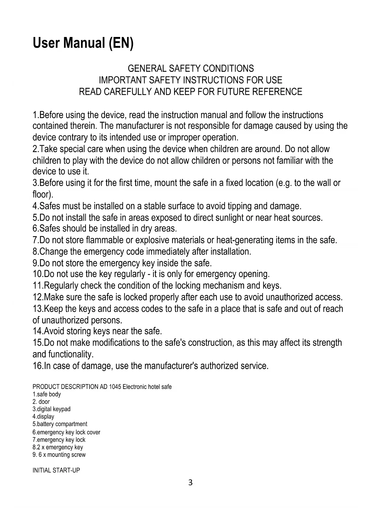 READ CAREFULLY AND KEEP FOR FUTURE REFERENCE 1.Before using the device, read the instruction manual and follow the instructions contained therein. The manufacturer is not responsible for damage caused by using the device contrary to its intended use or improper operation. 2.Take special care when using the device when children are around. Do not allow children to play with the device do not allow children or persons not familiar with the device to use it. 3.Before using it for the first time, mount the safe in a fixed location (e.g. to the wall or floor). 4.Safes must be installed on a stable surface to avoid tipping and damage. 5.Do not install the safe in areas exposed to direct sunlight or near heat sources. 6.Safes should be installed in dry areas. 7.Do not store flammable or explosive materials or heat-generating items in the safe. 8.Change the emergency code immediately after installation. 9.Do not store the emergency key inside the safe. 10.Do not use the key regularly - it is only for emergency opening. 11.Regularly check the condition of the locking mechanism and keys. 12.Make sure the safe is locked properly after each use to avoid unauthorized access. 13.Keep the keys and access codes to the safe in a place that is safe and out of reach of unauthorized persons. 14.Avoid storing keys near the safe. 15.Do not make modifications to the safe's construction, as this may affect its strength and functionality. 16.In case of damage, use the manufacturer's authorized service. PRODUCT DESCRIPTION AD 1045 Electronic hotel safe 1.safe body