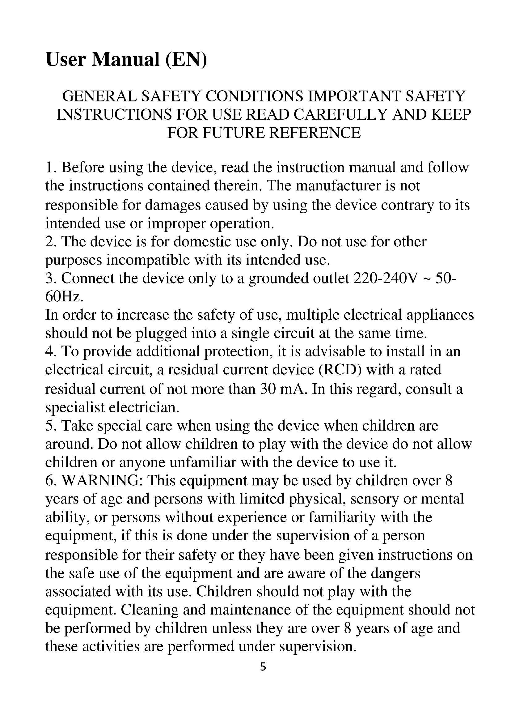 For the sake of the environment. Information about used electrical and electronic equipment In accordance with Article 13(1) and (2) of the Law of September 11, 2015 on waste electrical and electronic equipment, we inform you about the proper handling of waste electrical and electronic equipment: 1. It is forbidden to place waste electrical and electronic equipment together with other waste - this is confirmed by marking in the form of a "crossed out basket", ordering selective collection of this type of waste. 2. Electrical and electronic equipment may contain hazardous substances, mixtures and components that, when released into the environment, can cause serious danger to the health and life of humans and living organisms. They can lead to numerous health ailments, such as vision, hearing and speech disorders, and can also damage the kidneys, liver and heart, and cause skin diseases. Harmful substances, can also have adverse effects on the respiratory and reproductive systems and lead to cancerous changes. Consumption of plants growing on contaminated soils, and products made from them, can risk the aforementioned health effects. 3. Waste electrical and electronic equipment should be handed over only to authorized collection points, a list of which should be included on each Municipality's website. 4. The household plays an important role, in contributing to the reuse and recovery, including recycling, of waste equipment. It also plays a key role in the waste electrical and electronic equipment management system due to the possibility of direct delivery to authorized collection points and the elimination of undesirable social habits resulting in leaving waste equipment in places not intended for it. In addition, Donate waste electrical and electronic equipment at the point of delivery. A distributor, when supplying equipment intended for households to a purchaser, is obliged to take back used household equipment free of charge at the place of delivery of such equipment, provided the used equipment is of the same type and performed the same functions as the supplied equipment. Cardboard packaging and polyethylene (PE) bags should be placed in the appropriate containers for separate collection of municipal waste according to their description. If there are batteries in the equipment, remove them and separately dispose of them at a collection and storage facility. Do not dispose of the device in the municipal waste container!!! Service If you wish to purchase spare parts or report any complaints, please contact directly with the seller who issued the receipt. Bedienungsanleitung (DE)