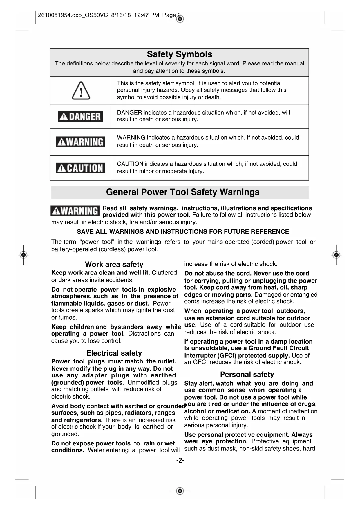 Versión en español Ver la página 26 Call Toll Free for Consumer Information and Service Locations Pour obtenir des informations et les adresses de nos centres de service après-vente, appelez ce numéro gratuit Llame gratis para obtener información para el consumidor y ubicaciones de servicio OS50VC 2610051954.qxp_OS50VC 8/16/18 12:47 PM Page 1-2- Work area safety Keep work area clean and well lit. Cluttered or dark areas invite accidents. Do not operate power tools in explosive atmospheres, such as in the presence of flammable liquids, gases or dust. Power tools create sparks which may ignite the dust or fumes. Keep children and bystanders away while operating a power tool. Distractions can cause you to lose control. Electrical safety Power tool plugs must match the outlet. Never modify the plug in any way. Do not use any adapter plugs with earthed (grounded) power tools. Unmodified plugs and matching outlets will reduce risk of electric shock. Avoid body contact with earthed or grounded surfaces, such as pipes, radiators, ranges and refrigerators. There is an increased risk of electric shock if your body is earthed or grounded. Do not expose power tools to rain or wet conditions. Water entering a power tool will increase the risk of electric shock. Do not abuse the cord. Never use the cord for carrying, pulling or unplugging the power tool. Keep cord away from heat, oil, sharp edges or moving parts. Damaged or entangled cords increase the risk of electric shock. When operating a power tool outdoors, use an extension cord suitable for outdoor use. Use of a cord suitable for outdoor use reduces the risk of electric shock. If operating a power tool in a damp location is unavoidable, use a Ground Fault Circuit Interrupter (GFCI) protected supply. Use of an GFCI reduces the risk of electric shock. Personal safety Stay alert, watch what you are doing and use common sense when operating a power tool. Do not use a power tool while you are tired or under the influence of drugs, alcohol or medication. A moment of inattention while operating power tools may result in serious personal injury. Use personal protective equipment. Always wear eye protection. Protective equipment such as dust mask, non-skid safety shoes, hard General Power Tool Safety Warnings Safety Symbols The definitions below describe the level of severity for each signal word. Please read the manual and pay attention to these symbols.