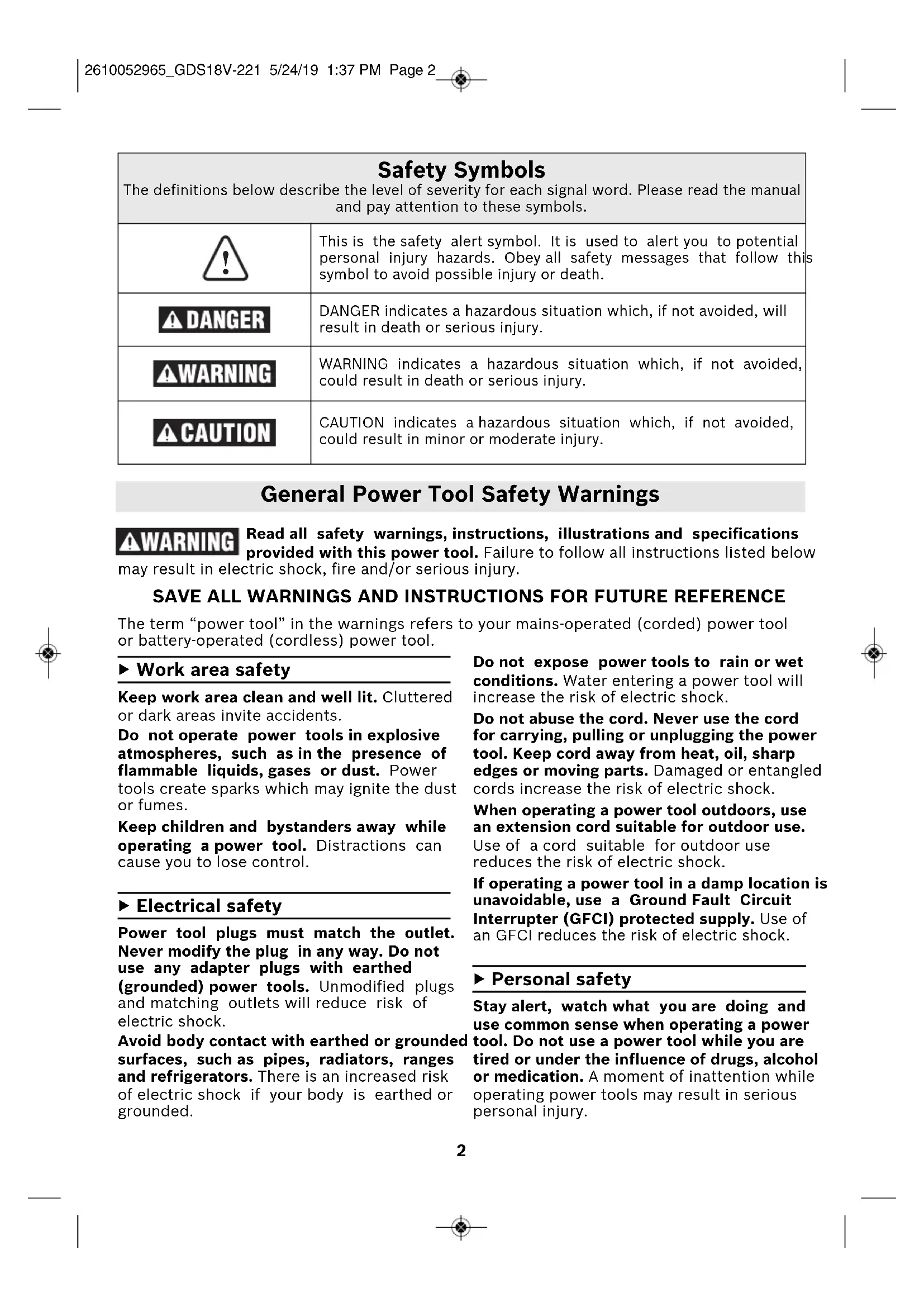 This is the safety alert symbol. It is used to alert you to potentialpersonal injury hazards. Obey all safety messages that follow thissymbol to avoid possible injury or death.DANGER indicates a hazardous situation which, if not avoided, willresult in death or serious injury.WARNING indicates a hazardous situation which, if not avoided,could result in death or serious injury.CAUTION indicates a hazardous situation which, if not avoided,could result in minor or moderate injury. 2610052965_GDS18V-221 5/24/19 1:37 PM Page 23 General Power Tool Safety Warnings Use personal protective equipment. Always