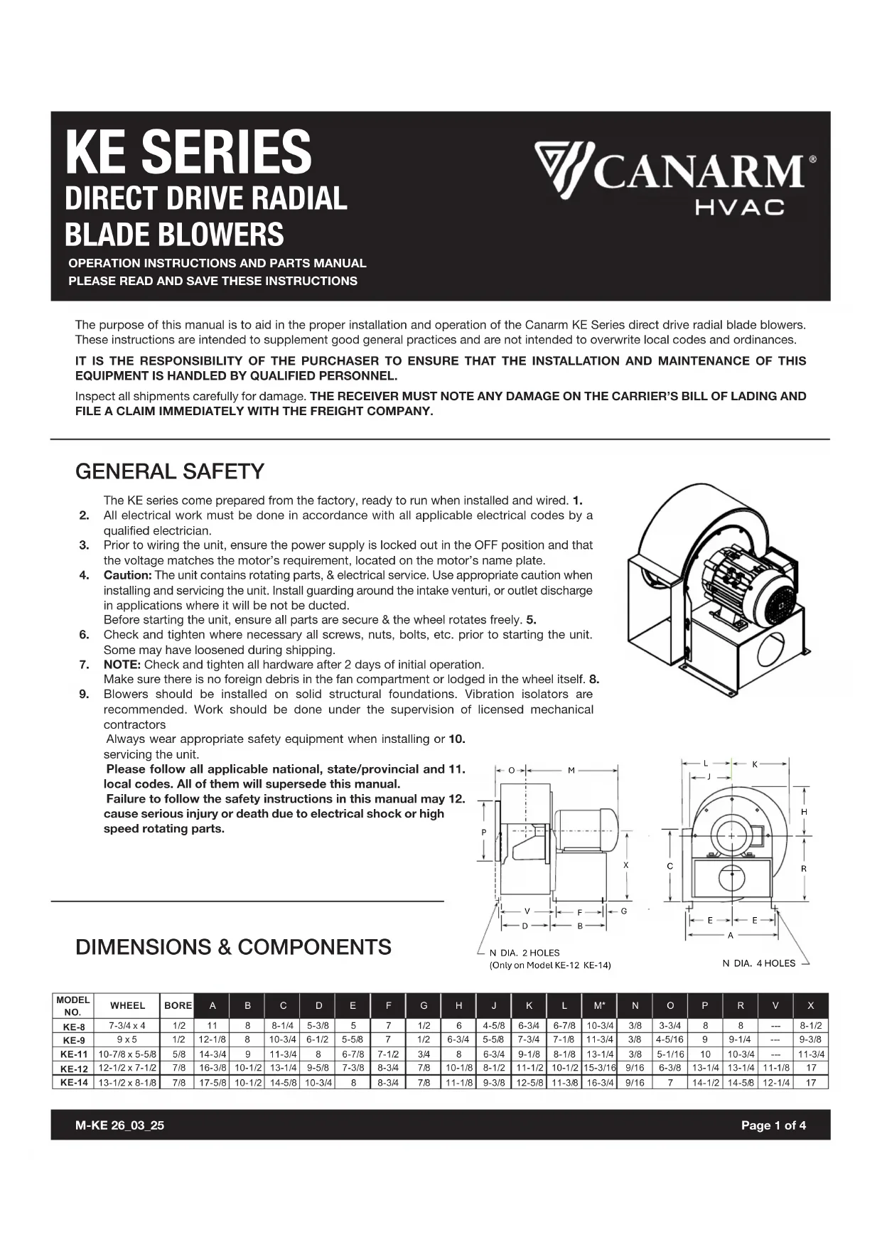 Page 1 of 4M-KE 26_03_25 GENERAL SAFETY DIMENSIONS & COMPONENTS The purpose of this manual is to aid in the proper installation and operation of the Canarm KE Series direct drive radial blade blowers. These instructions are intended to supplement good general practices and are not intended to overwrite local codes and ordinances. IT IS THE RESPONSIBILITY OF THE PURCHASER TO ENSURE THAT THE INSTALLATION AND MAINTENANCE OF THIS EQUIPMENT IS HANDLED BY QUALIFIED PERSONNEL. Inspect all shipments carefully for damage. THE RECEIVER MUST NOTE ANY DAMAGE ON THE CARRIER’S BILL OF LADING AND FILE A CLAIM IMMEDIATELY WITH THE FREIGHT COMPANY.The KE series come prepared from the factory, ready to run when installed and wired. 1. All electrical work must be done in accordance with all applicable electrical codes by a 2. qualified electrician. Prior to wiring the unit, ensure the power supply is locked out in the OFF position and that 3. the voltage matches the motor’s requirement, located on the motor’s name plate. Caution: The unit contains rotating parts, & electrical service. Use appropriate caution when 4. installing and servicing the unit. Install guarding around the intake venturi, or outlet discharge in applications where it will be not be ducted. Before starting the unit, ensure all parts are secure & the wheel rotates freely. 5. Check and tighten where necessary all screws, nuts, bolts, etc. prior to starting the unit. 6. Some may have loosened during shipping. NOTE: Check and tighten all hardware after 2 days of initial operation. 7. Make sure there is no foreign debris in the fan compartment or lodged in the wheel itself. 8. Blowers should be installed on solid structural foundations. Vibration isolators are 9. recommended. Work should be done under the supervision of licensed mechanical contractors Always wear appropriate safety equipment when installing or 10.servicing the unit. Please follow all applicable national, state/provincial and 11.local codes. All of them will supersede this manual. Failure to follow the safety instructions in this manual may 12.cause serious injury or death due to electrical shock or high speed rotating parts. !"#$%&'&% ($) (( * *"($% +"#$* + ! ($) , %"+$* ,"#$% ,"!$* (-"#$% #$* #"#$% * * """ *"($) .&'&+ ($) ()"($* * (-"#$% ,"($) +"+$* ! ($) ,"#$% +"+$* !"#$% !"($* (("#$% #$* %"+$(, . ."($% """ ."#$* (-"!$*&'&+"+$* +$* (%"#$% . (("#$% * ,"!$* !"($) #$% * ,"#$% ."($* *"($* (#"($% #$* +"($(, (- (-"#$% """ (("#$% ()"($)&'&!"($) !$* (,"#$* (-"($) (#"($% ."+$* !"#$* *"#$% !$* (-"($* *"($) (("($) (-"($) (+"#$(, .$(, ,"#$* (#"($% (#"($% (("($* (! (#"($)&'&*"($* !$* (!"+$* (-"($) (%"+$* (-"#$% * *"#$% !$* (("($* ."#$* ()"+$* (("#$* (,"#$% .$(, ! (%"($) (%"+$* ()"($% (! /01234 5 6 789:;<=