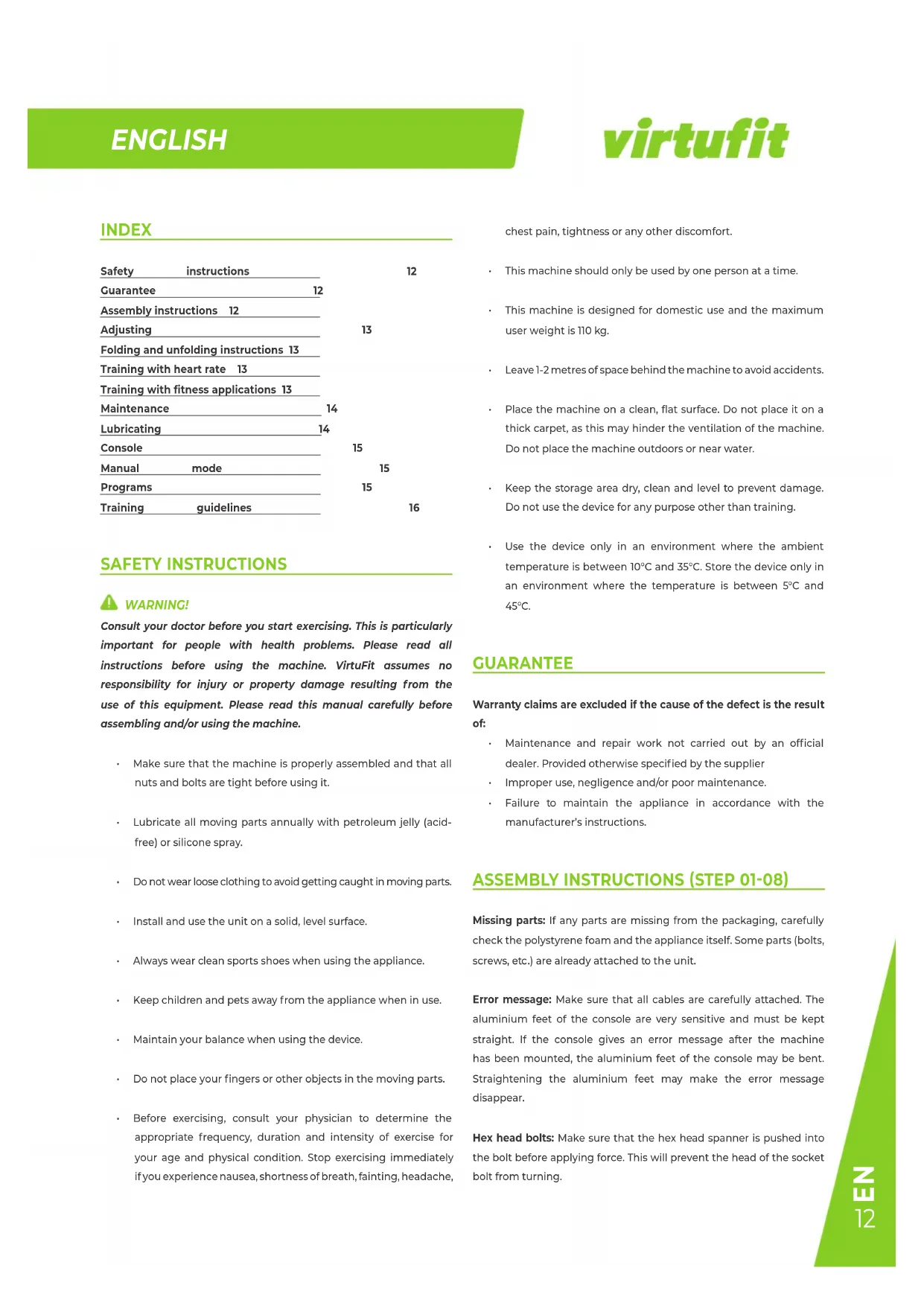 INDEX Safety instructions 12 Guarantee 12 Assembly instructions 12 Adjusting 13 Folding and unfolding instructions 13 Training with heart rate 13 Training with fitness applications 13 Maintenance 14 Lubricating 14 Console 15 Manual mode 15 Programs 15 Training guidelines 16 SAFETY INSTRUCTIONS WARNING! Consult your doctor before you start exercising. This is particularly important for people with health problems. Please read all instructions before using the machine. VirtuFit assumes no responsibility for injury or property damage resulting from the use of this equipment. Please read this manual carefully before assembling and/or using the machine.