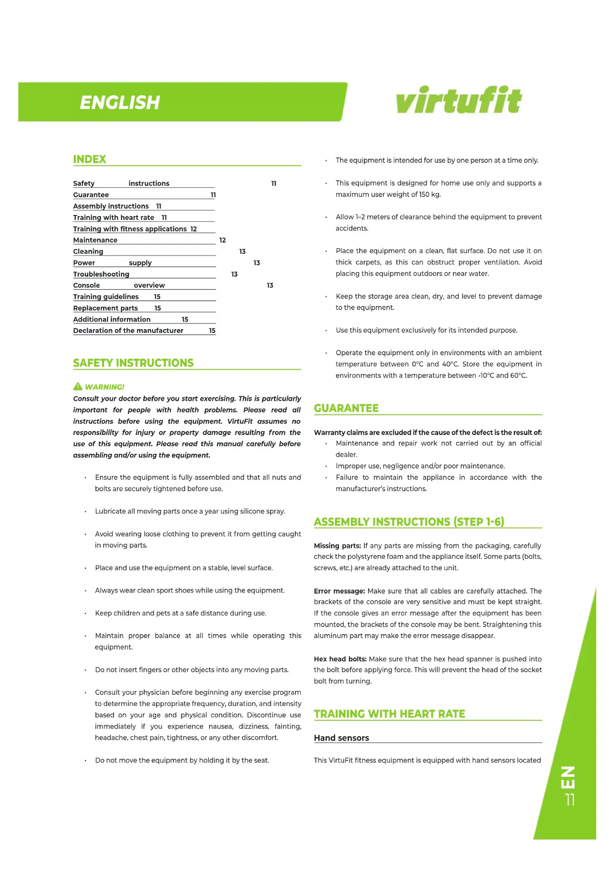 INDEX Safety instructions 11Guarantee 11Assembly instructions 11Training with heart rate 11Training with fitness applications 12Maintenance 12Cleaning 13Power supply 13Troubleshooting 13Console overview 13Trainingguidelines 15Replacementparts 15Additionalinformation 15Declarationofthemanufacturer 15 SAFETY INSTRUCTIONS WARNING! Consult your doctor before you start exercising. This is particularly important for people with health problems. Please read all instructions before using the equipment. VirtuFit assumes no responsibility for injury or property damage resulting from the use of this equipment. Please read this manual carefully before assembling and/or using the equipment.