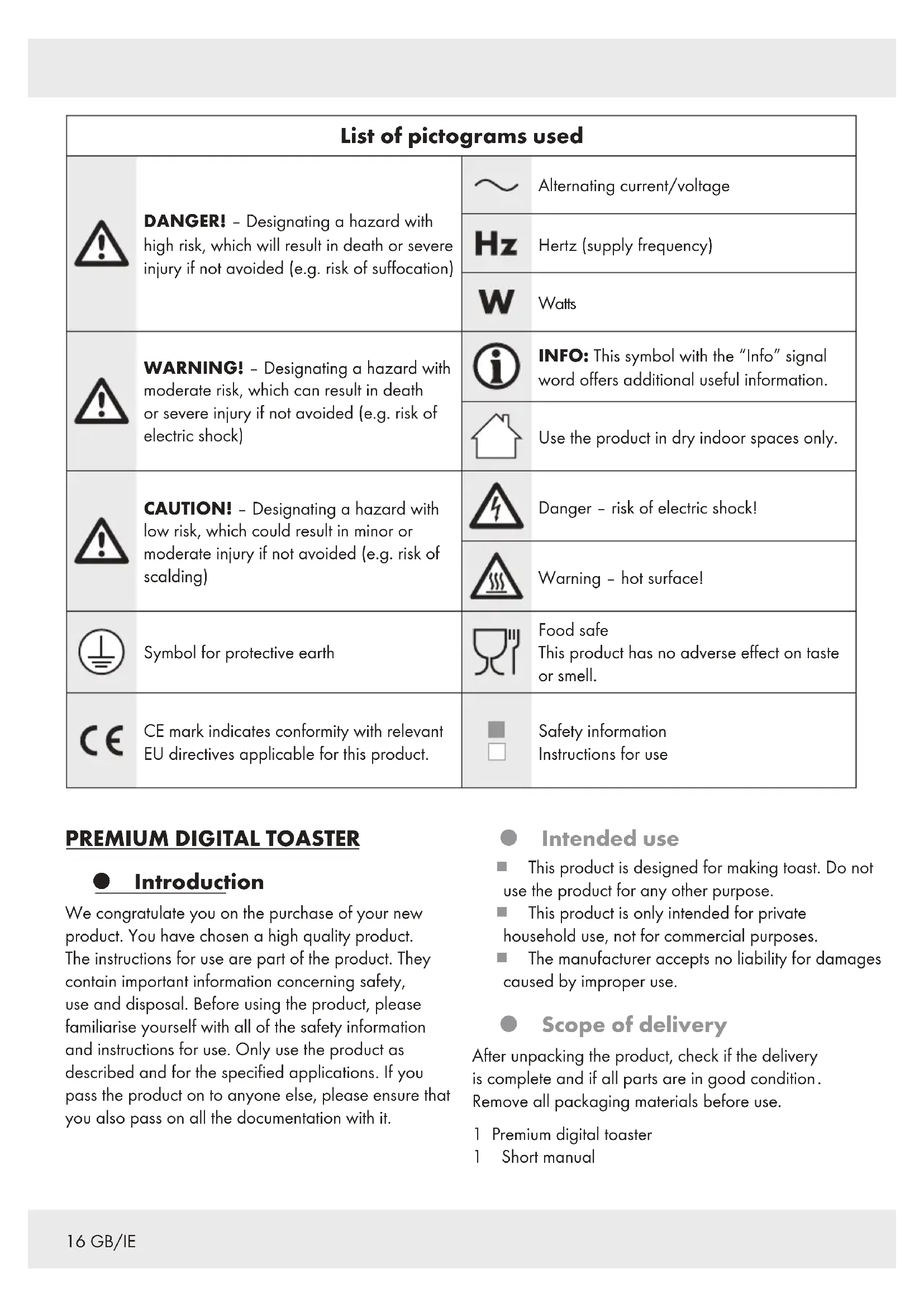 Remove all packaging materials before use. 1 Premium digital toaster 1 Short manual17GB/IE Description of parts Before reading, unfold the page containing the illustrations and familiarise yourself with all the functions of the product. [1] Toasting slots [2] Timer display [3] –(Button to decrease the browning level) [4] +(Button to increase the browning level) [5] (Defrost button with indicator light) [6] (Stop button) [7] (Reheat button with indicator light) [8] Bread roll warmer [9] Feet [] Cord rewind [] Cord clamp [] Mains cord with mains plug [] Crumb tray [] Fold-out lever (for the bread roll warmer) [] Browning level display [] Lever Technical data Input voltage: 220–240 V∼, 50–60 Hz Power consumption: 730–870 W Power consumption in off mode: 0.2 W Protection class: I Certification: GS (TÜV Rheinland) Safety instructions BEFORE USING THE PRODUCT,