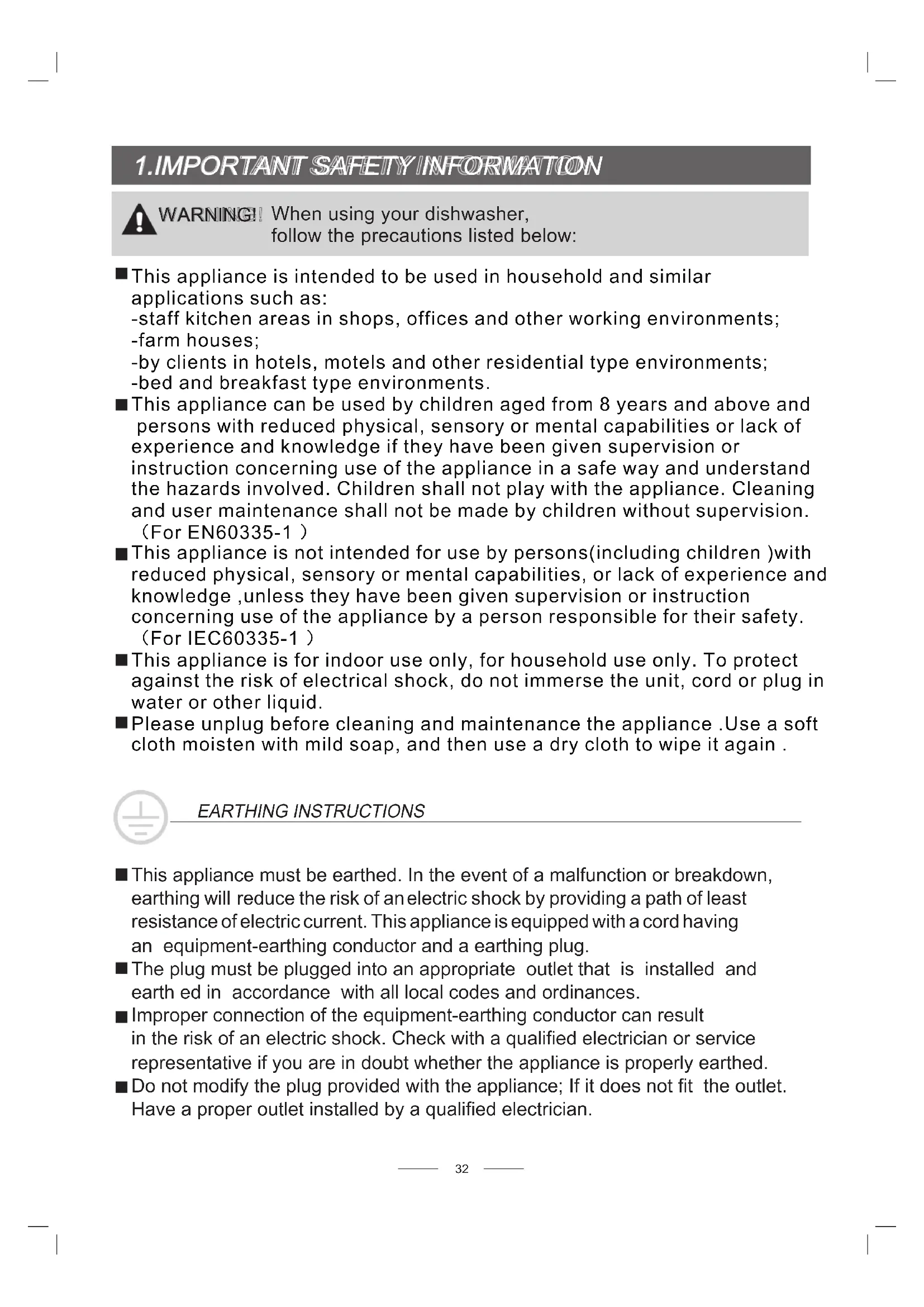 ARNING! EARTHING INSTRUCTIONS This appliance must be earthed. In the event of a malfunction or breakdown, earthing will reduce the risk of an electric shock by providing a path of least resistance of electric current. This appliance is equipped with a cord having an equipment-earthing conductor and a earthing plug. The plug must be plugged into an appropriate outlet that is installed and earth ed in accordance with all local codes and ordinances. Improper connection of the equipment-earthing conductor can result in the risk of an electric shock. Check with a qualified electrician or service representative if you are in doubt whether the appliance is properly earthed. Do not modify the plug provided with the appliance; If it does not fit the outlet. Have a proper outlet installed by a qualified electrician.