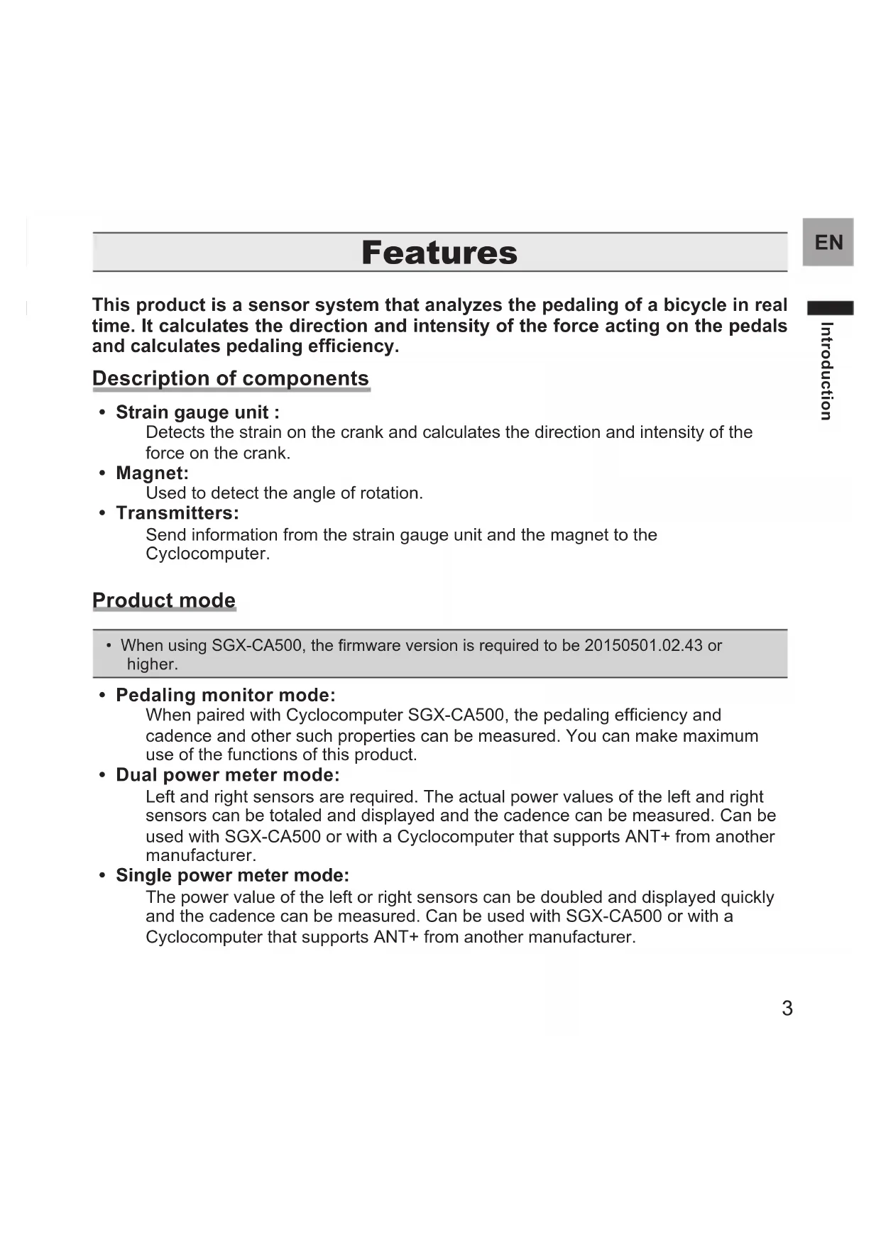 - Single power meter mode: The power value of the left or right sensors can be doubled and displayed quickly and the cadence can be measured. Can be used with SGX-CA500 or with a Cyclocomputer that supports ANT+ from another manufacturer.4