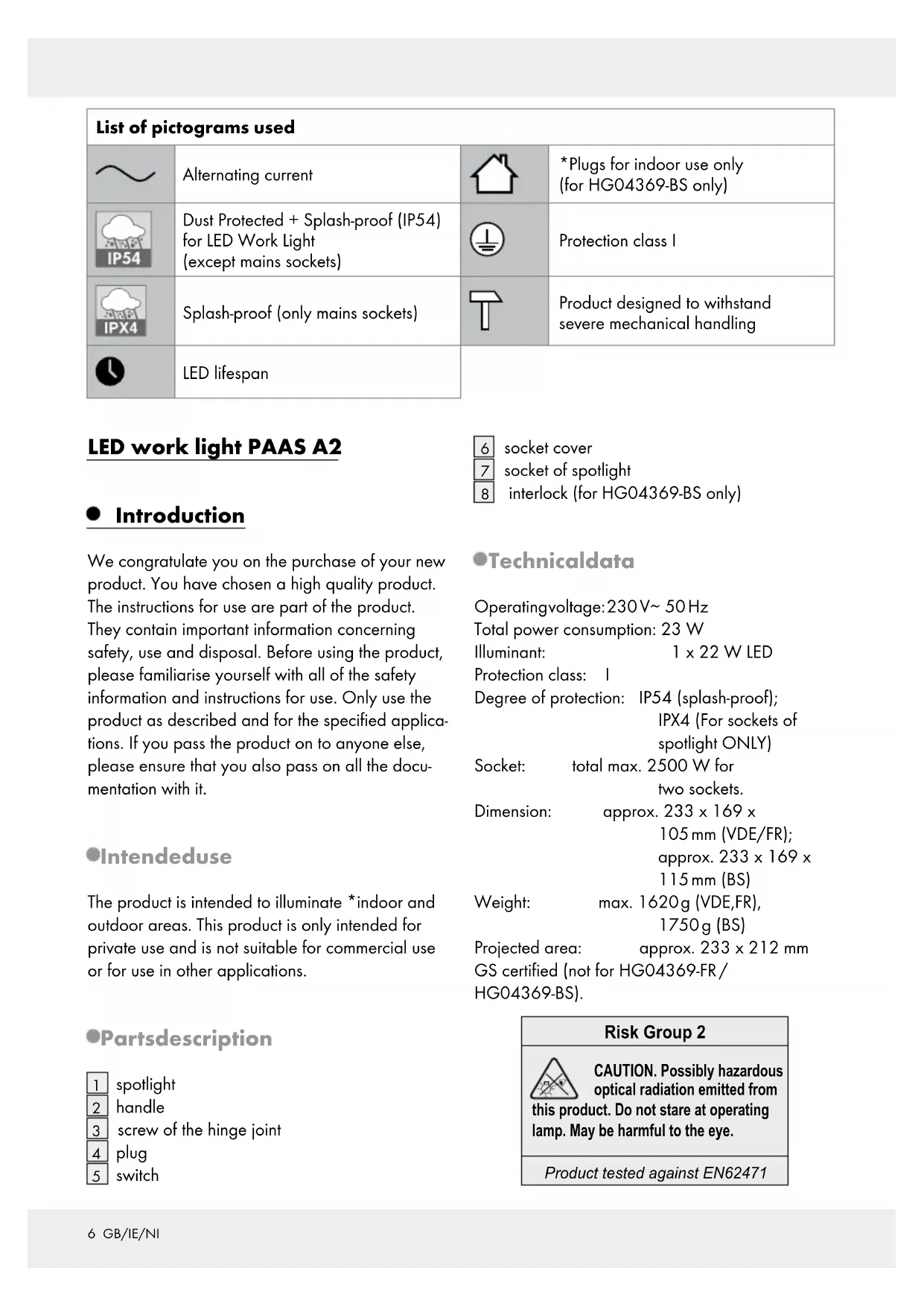 interlock (for HG04369-BS only) Technical data Operating voltage: 230 V∼ 50 Hz Total power consumption: 23 W Illuminant: 1 x 22 W LED Protection class: I Degree of protection: IP54 (splash-proof); IPX4 (For sockets of spotlight ONLY) Socket: total max. 2500 W for two sockets. Dimension: approx. 233 x 169 x 105 mm (VDE/FR); approx. 233 x 169 x 115 mm (BS) Weight: max. 1620 g (VDE,FR), 1750 g (BS) Projected area: approx. 233 x 212 mm GS certified (not for HG04369-FR / HG04369-BS). Risk Group 2 Product tested against EN62471 CAUTION. Possibly hazardous optical radiation emitted from this product. Do not stare at operating lamp. May be harmful to the eye.7 GB/IE/NI Scope of delivery Check immediately after unpacking that the parts are complete and that the product is in proper con- dition. 1 LED Workshop spotlight 1 Instructions for use General safety instructions