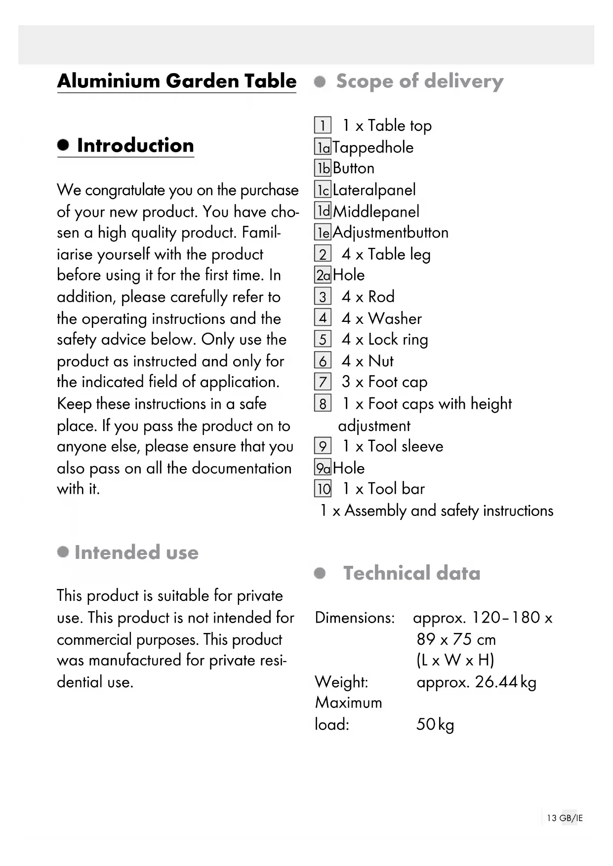 1 x Tool bar 1 x Assembly and safety instructions Technical data Dimensions: approx. 120‒180 x 89 x 75 cm (L x W x H) Weight: approx. 26.44 kg Maximum load: 50 kg14 GB/IE Safety notices