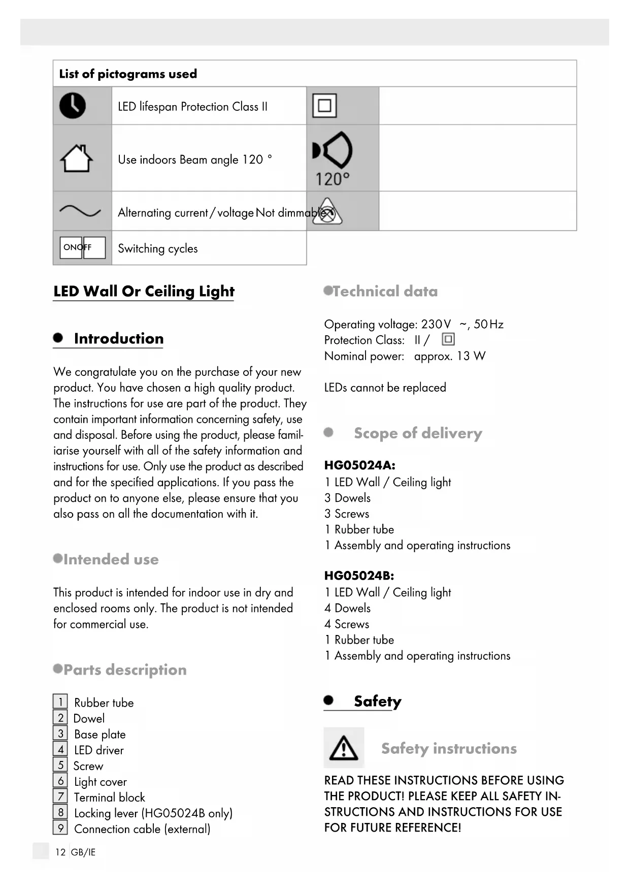 , 50 Hz Protection Class: II / Nominal power: approx. 13 W LEDs cannot be replaced Scope of delivery HG05024A: 1 LED Wall / Ceiling light 3 Dowels 3 Screws 1 Rubber tube 1 Assembly and operating instructions HG05024B: 1 LED Wall / Ceiling light 4 Dowels 4 Screws 1 Rubber tube 1 Assembly and operating instructions Safety Safety instructions