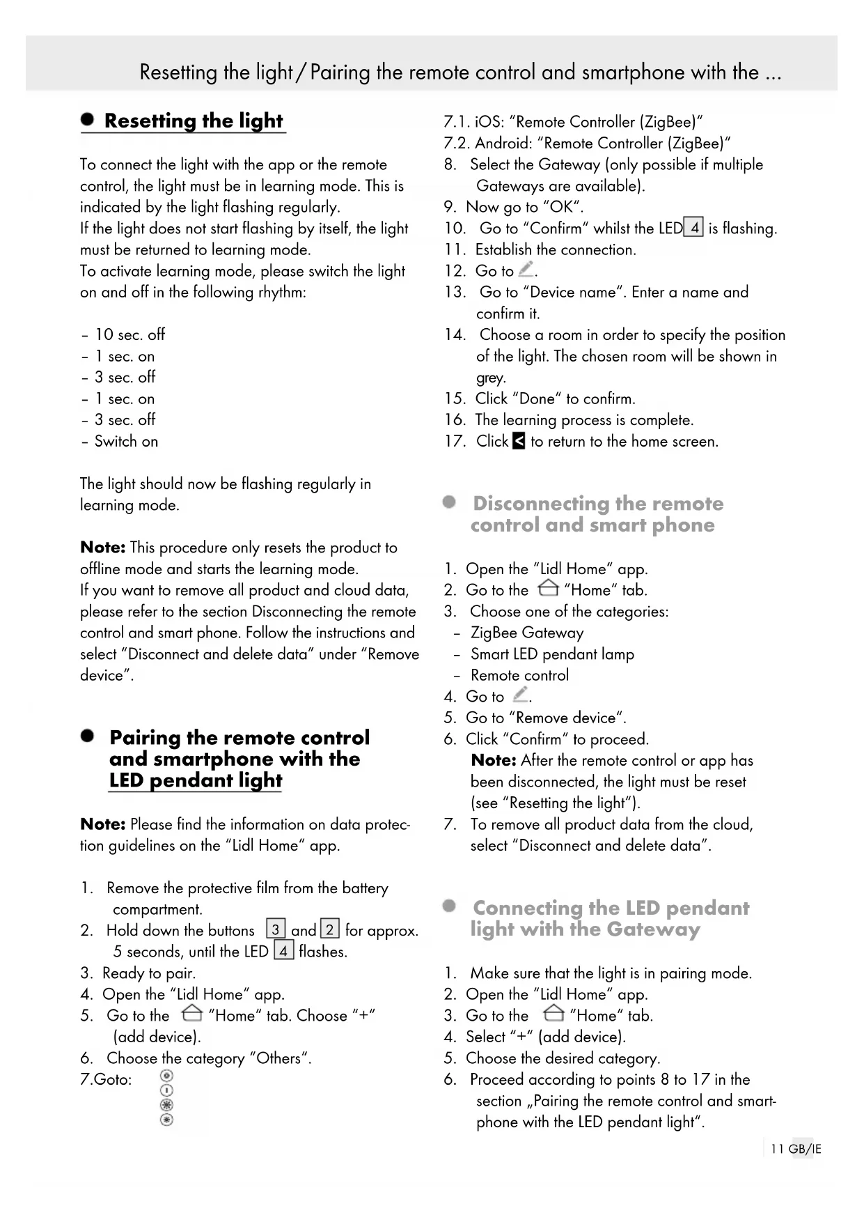 Wall plugs Scope of delivery 1 Remote control 2 Wall plugs 2 Screws 2 Self-adhesive pads Technical data Model number: 14149005L / 14149006L ZigBee: Version: 3.0 Compatible: iOS 9.0 / Android 5.0 Frequency: 2.4 GHz ISM Band Max. transmitting power: <+ 10 dBm Remote control: Range: 9 m Battery: 1 x CR 2450 Max. transmitting power: 13 dBm Frequency: 2.4‒2.485 GHz Resetting the light / Pairing the remote control and smartphone with the …11 GB/IE Parts description / Technical data Resetting the light / Pairing the remote control and smartphone with the … Resetting the light To connect the light with the app or the remote control, the light must be in learning mode. This is indicated by the light flashing regularly. If the light does not start flashing by itself, the light must be returned to learning mode. To activate learning mode, please switch the light on and off in the following rhythm: – 10 sec. off – 1 sec. on – 3 sec. off – 1 sec. on – 3 sec. off – Switch on The light should now be flashing regularly in learning mode. Note: This procedure only resets the product to offline mode and starts the learning mode. If you want to remove all product and cloud data, please refer to the section Disconnecting the remote control and smart phone. Follow the instructions and select “Disconnect and delete data” under “Remove device”. Pairing the remote control and smartphone with the LED pendant light Note: Please find the information on data protec- tion guidelines on the “Lidl Home“ app.