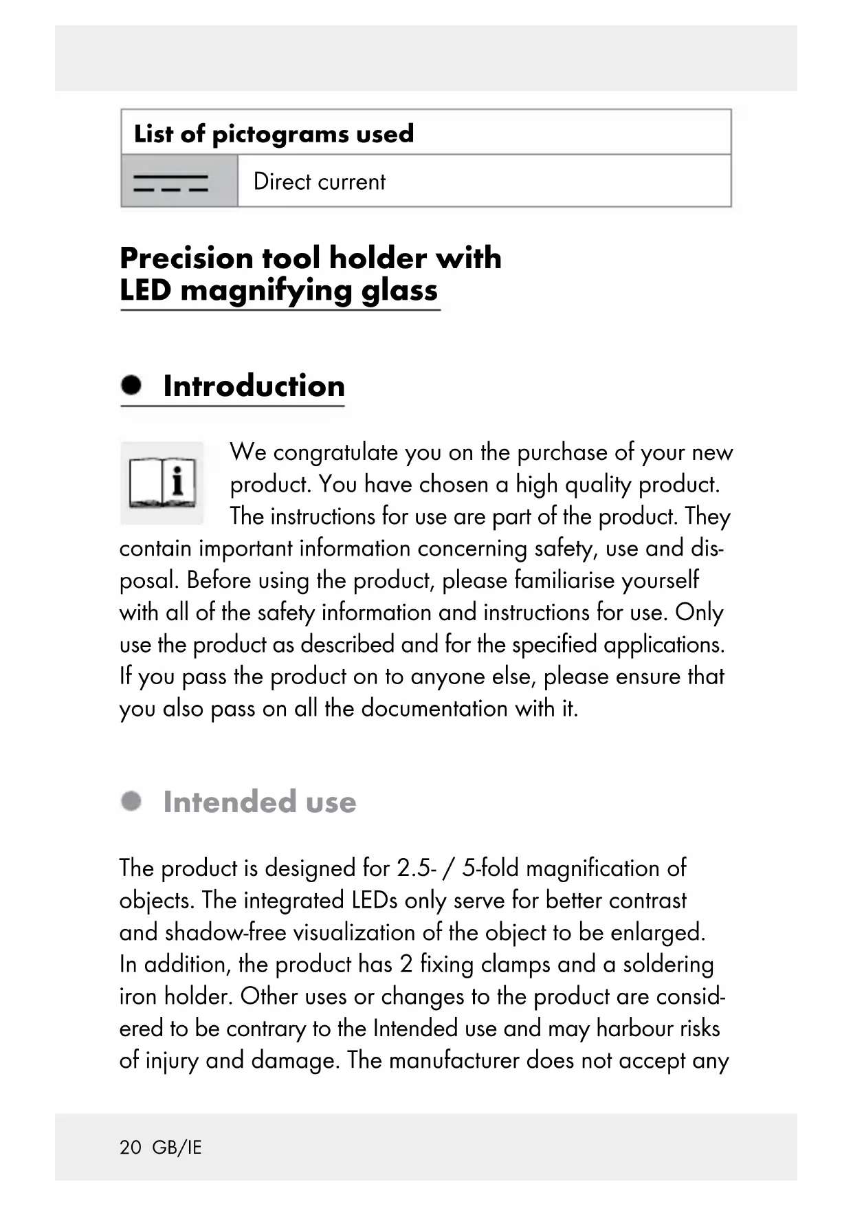 Ribbon (inside battery compartment) Technical data Operating voltage: 4.5 volts Batteries: 3 x 1.5 V , AAA type Max. power rating: 2 x 0.06 W Bulbs: 2 x LED (not replaceable) Magnification / magnifying glass: 2.5 / 5 times Dimensions: approx. 23 x 12 x 16 cm (W x H x D) Chromaticity coordinate: X < 0.27 or X > 0.530; Y < -2.3172 X + 2.3653 X–0.2199 or Y > -2.3172 X + 2.3653 X - 0.1595 Includes Immediately after unpacking please check the package con- tents for completeness and if all parts and the product are in good condition. Do not under any circumstances use the product if the delivery is incomplete.23 GB/IE 1 Precision LED magnifying glass 3 Batteries, 1.5 V , AAA 1 Operating Instructions Safety General safety information KEEP ALL THE SAFETY ADVICE AND INSTRUCTIONS IN A SAFE PLACE FOR FUTURE REFERENCE!