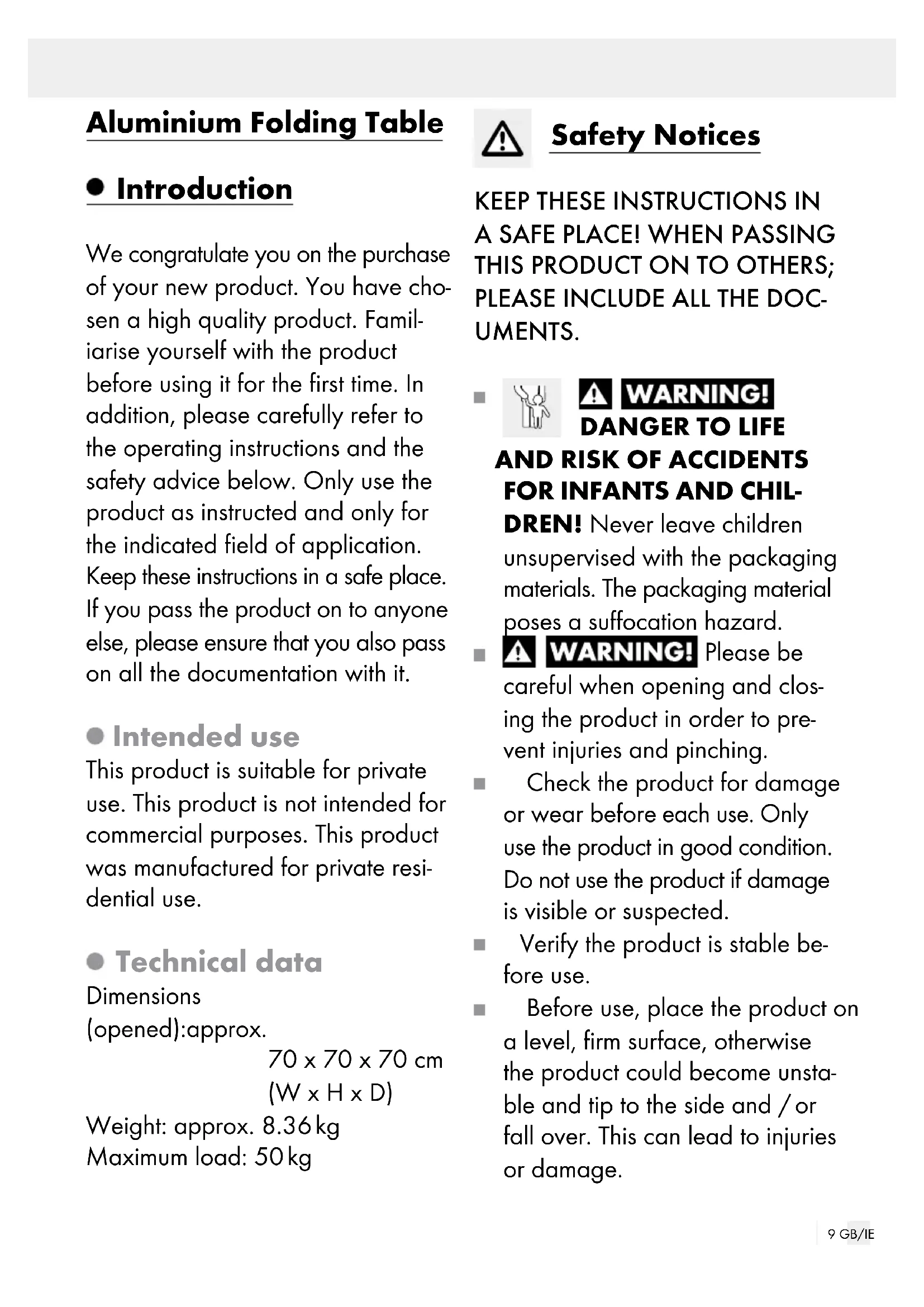 DREN! Never leave children unsupervised with the packaging materials. The packaging material poses a suffocation hazard. Please be careful when opening and clos- ing the product in order to pre- vent injuries and pinching. Check the product for damage or wear before each use. Only use the product in good condition. Do not use the product if damage is visible or suspected. Verify the product is stable be- fore use. Before use, place the product on a level, firm surface, otherwise the product could become unsta- ble and tip to the side and / or fall over. This can lead to injuries or damage.10 GB/IE 50 kg Observe the maximum load capacity of 50 kg. If the weight limit is exceeded, this can lead to product damage and / or injuries. Please ensure that persons, es- pecially children, do not stand on the product or pull themselves up on it. The product could fall over. Do not sit or stand on the product Keep your hands out of the fold- ing mechanism in order to avoid the risk of injury. Ensure that the folding function is correctly locked in place be- fore using the product. Ensure that the product has been fully opened before using it. This product is not a toy and should be used under adult su- pervision. The product is not a climbing frame or a toy! Secure the product in extreme weather, e.g. strong wind. Do not use the product close to a naked flame.