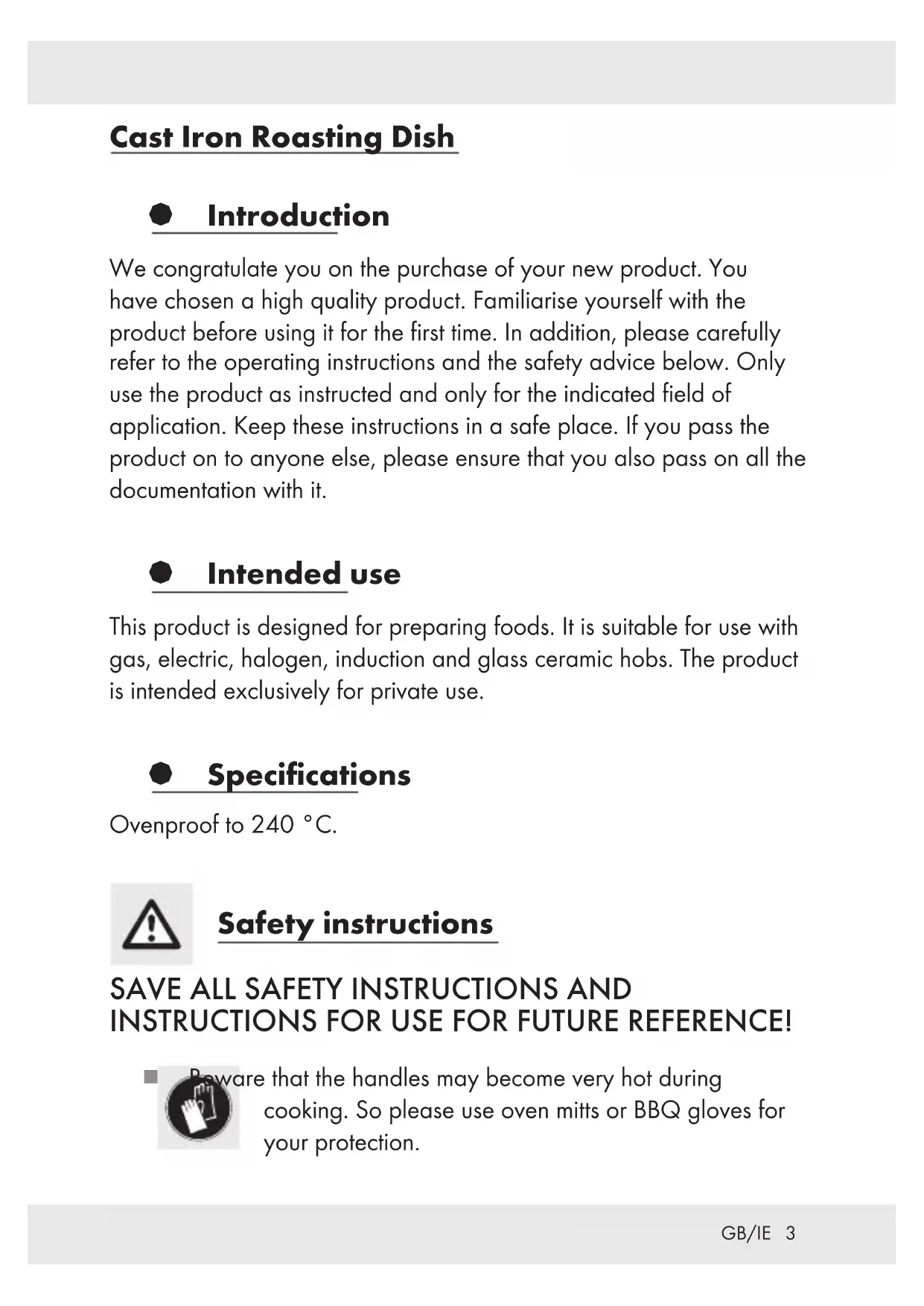 GB/IE Cast Iron Roasting Dish § Introduction We congratulate you on the purchase of your new product. You have chosen a high quality product. Familiarise yourself with the product before using it for the first time. In addition, please carefully refer to the operating instructions and the safety advice below. Only use the product as instructed and only for the indicated field of application. Keep these instructions in a safe place. If you pass the product on to anyone else, please ensure that you also pass on all the documentation with it. § Intended use This product is designed for preparing foods. It is suitable for use with gas, electric, halogen, induction and glass ceramic hobs. The product is intended exclusively for private use. § Specifications Ovenproof to 240 °C. Safety instructions