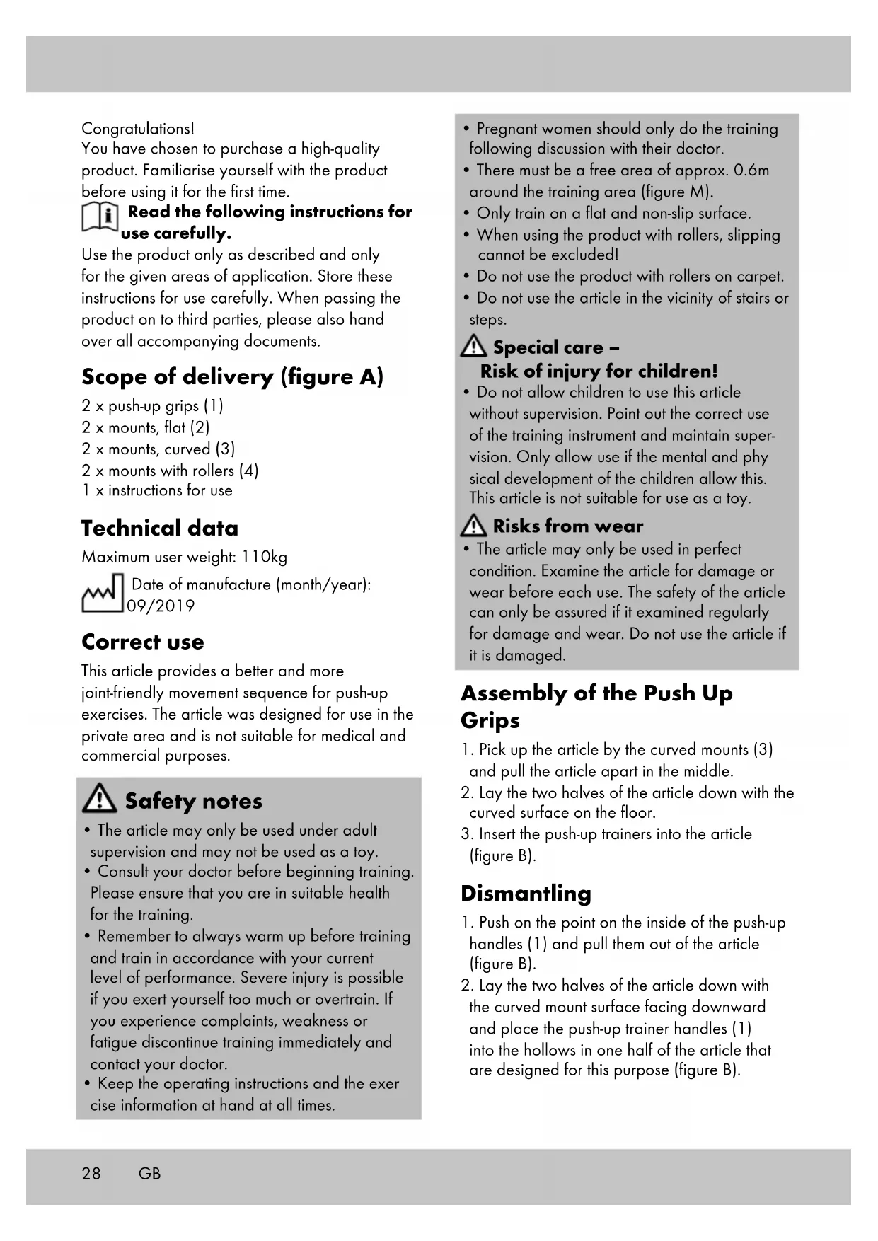 - The article may only be used in perfect condition. Examine the article for damage or wear before each use. The safety of the article can only be assured if it examined regularly for damage and wear. Do not use the article if it is damaged. Assembly of the Push Up Grips