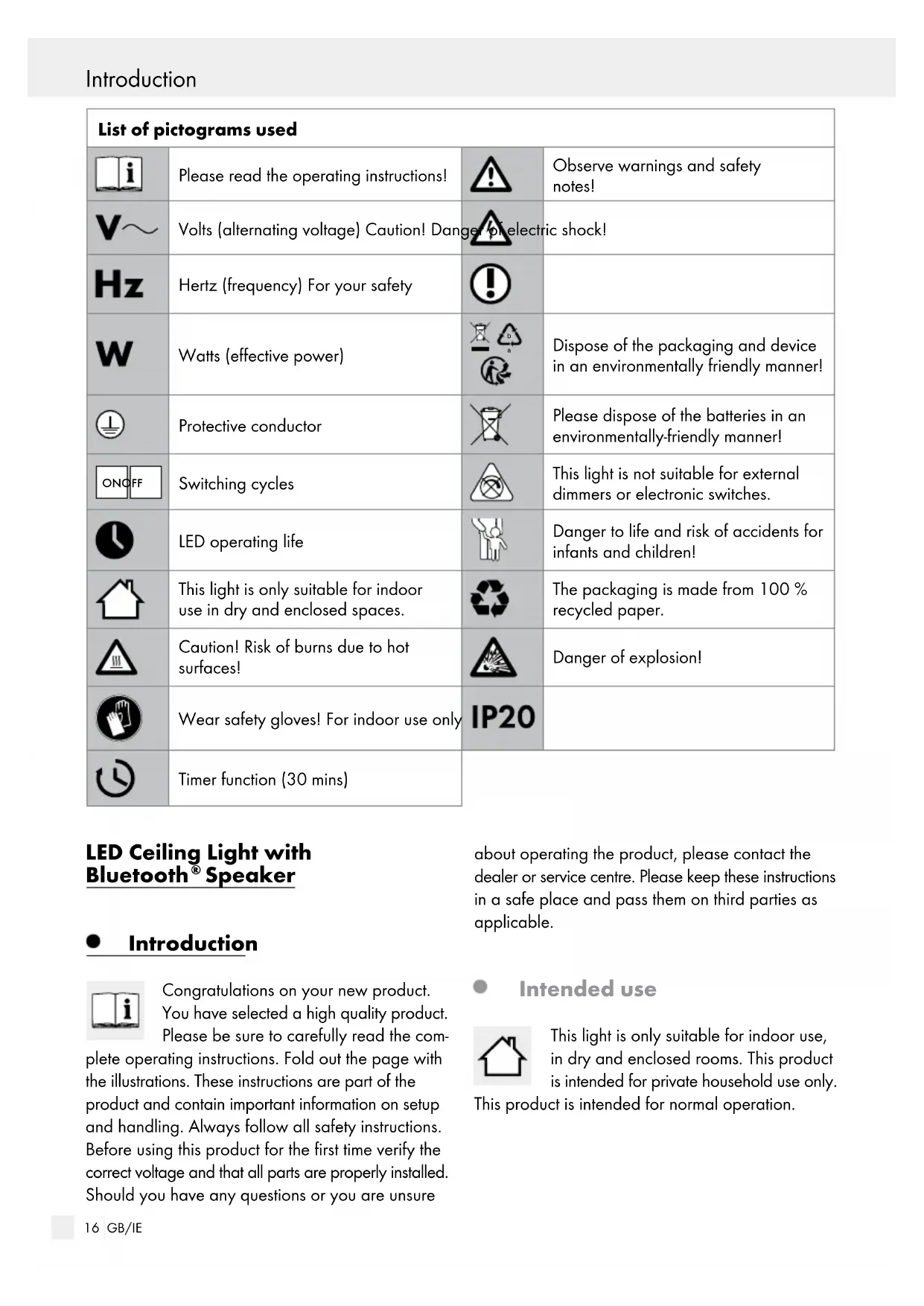 , 50 Hz Total rated power: max. 25 W (LED 20 W, speaker 5 W) Protection class: | / IP rating: IP20 LED: Illuminant: LED module Rated power: LED, max. 17.5 W IP rating: IP20 Speaker / bluetooth: Frequency range Speaker: 120 ‒ 20000 Hz Bluetooth version: 5.0 Bluetooth range: < 10 m Frequency range Bluetooth frequency: 2.4 GHz ISM frequency range RF output: max. +2dBm Remote control: Batteries: 2 x 1.5 V AAA Remote control range: 5‒6 m (infrared) Safety Safety information Damage due to failure to comply with these operating instructions will invalidate the guarantee! We assume no liability for consequential damage! We assume no liability for material damage or personal injury due to improper handling or failure to comply with the safety instructions! DANGER TO