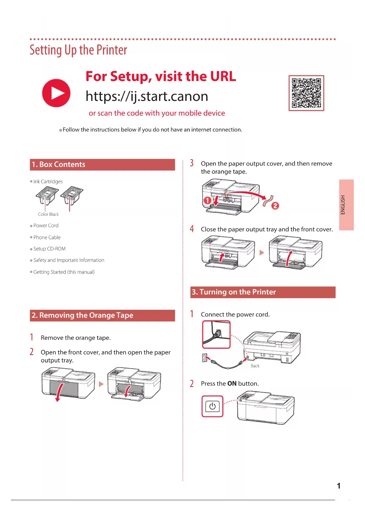 Press the ON button. For Setup, visit the URL https://ij.start.canon or scan the code with your mobile device