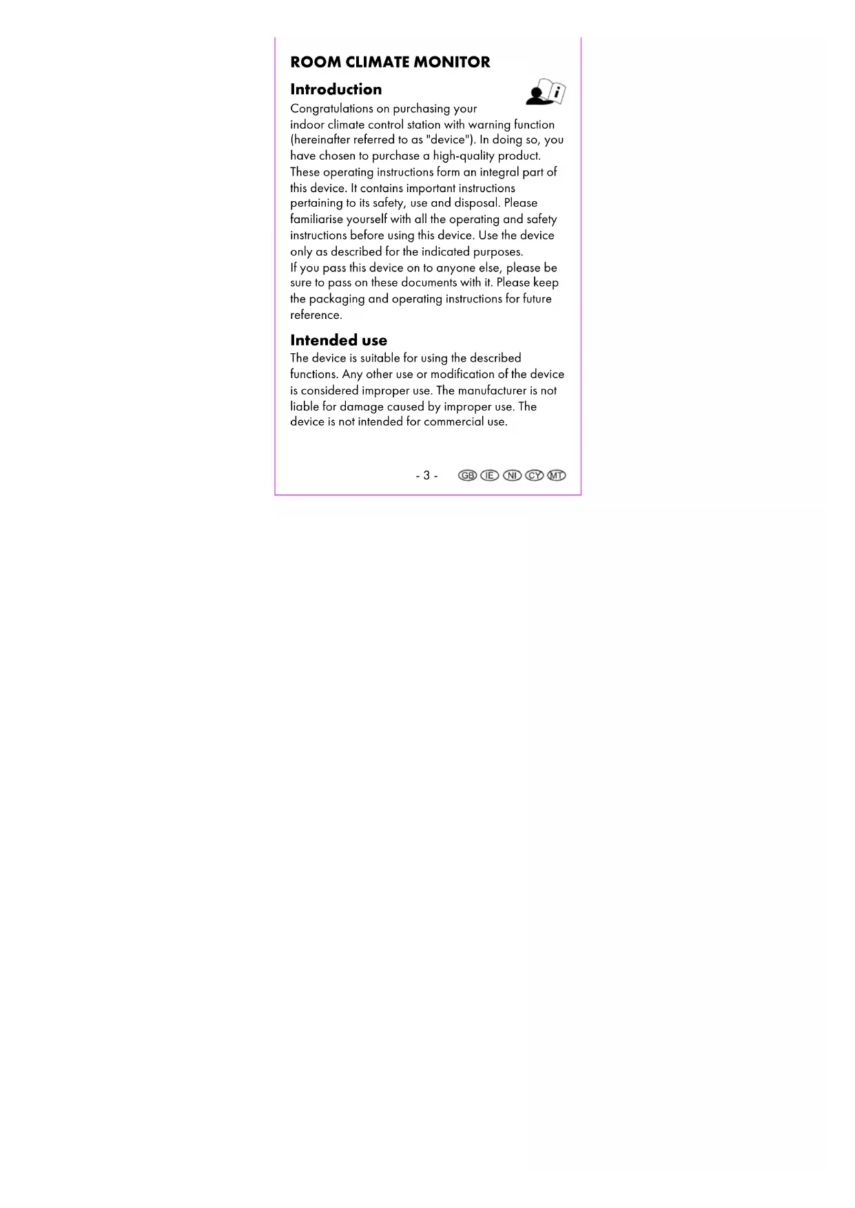 Introduction Congratulations on purchasing your indoor climate control station with warning function (hereinafter referred to as "device"). In doing so, you have chosen to purchase a high-quality product. These operating instructions form an integral part of this device. It contains important instructions pertaining to its safety, use and disposal. Please familiarise yourself with all the operating and safety instructions before using this device. Use the device only as described for the indicated purposes. If you pass this device on to anyone else, please be sure to pass on these documents with it. Please keep the packaging and operating instructions for future reference. Intended use The device is suitable for using the described functions. Any other use or modification of the device is considered improper use. The manufacturer is not liable for damage caused by improper use. The device is not intended for commercial use.- 4 - Package contents Note: Please check the contents of the package after purchase. Check that all parts are present and not defective. If the delivery is incomplete and/or parts are damaged, do not use the device. Contact the service department (see "What to do to use the warranty"). 1 x Room climate control station 2 x batteries 1.5 V AAA LR03 1 x user manual Technical specifications Measuring range/temperature: 0 °C - 50 °C Measuring range/humidity: 20% - 95% Temperature display/tolerance in the core measuring range: +/- 1 °C Humidity indicator/tolerance in the core measuring range: 41% - 80% - ±3%; other range: ±5% Dimensions: approx. 115 x 74 x 24 mm Weight: Model 1: approx. 97 g (excl. batteries) Model 2: approx. 93 g (excl. batteries)- 5 - Batteries: 2 x 1.5 V AAA R03/LR03 — Indicator for DC voltage Explanation of symbols WARNING! This signal symbol/word indicates a hazard with a medium level of risk, which, if not avoided, could result in death or serious injury. Note: This signal word is used for additional information.