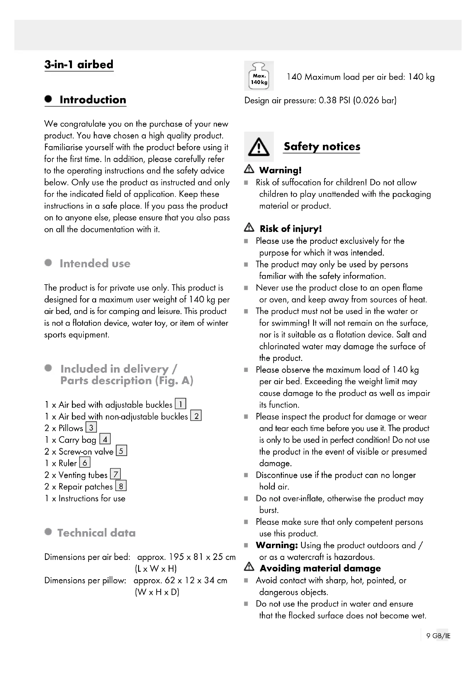 1 x Instructions for use Technical data Dimensions per air bed: approx. 195 x 81 x 25 cm (L x W x H) Dimensions per pillow: approx. 62 x 12 x 34 cm (W x H x D) Max. 140 kg 140 Maximum load per air bed: 140 kg Design air pressure: 0.38 PSI (0.026 bar) Safety notices Warning! Risk of suffocation for children! Do not allow children to play unattended with the packaging material or product. Risk of injury! Please use the product exclusively for the purpose for which it was intended. The product may only be used by persons familiar with the safety information. Never use the product close to an open flame or oven, and keep away from sources of heat. The product must not be used in the water or for swimming! It will not remain on the surface, nor is it suitable as a flotation device. Salt and chlorinated water may damage the surface of the product. Please observe the maximum load of 140 kg per air bed. Exceeding the weight limit may cause damage to the product as well as impair its function. Please inspect the product for damage or wear and tear each time before you use it. The product is only to be used in perfect condition! Do not use the product in the event of visible or presumed damage. Discontinue use if the product can no longer hold air. Do not over-inflate, otherwise the product may burst. Please make sure that only competent persons use this product.