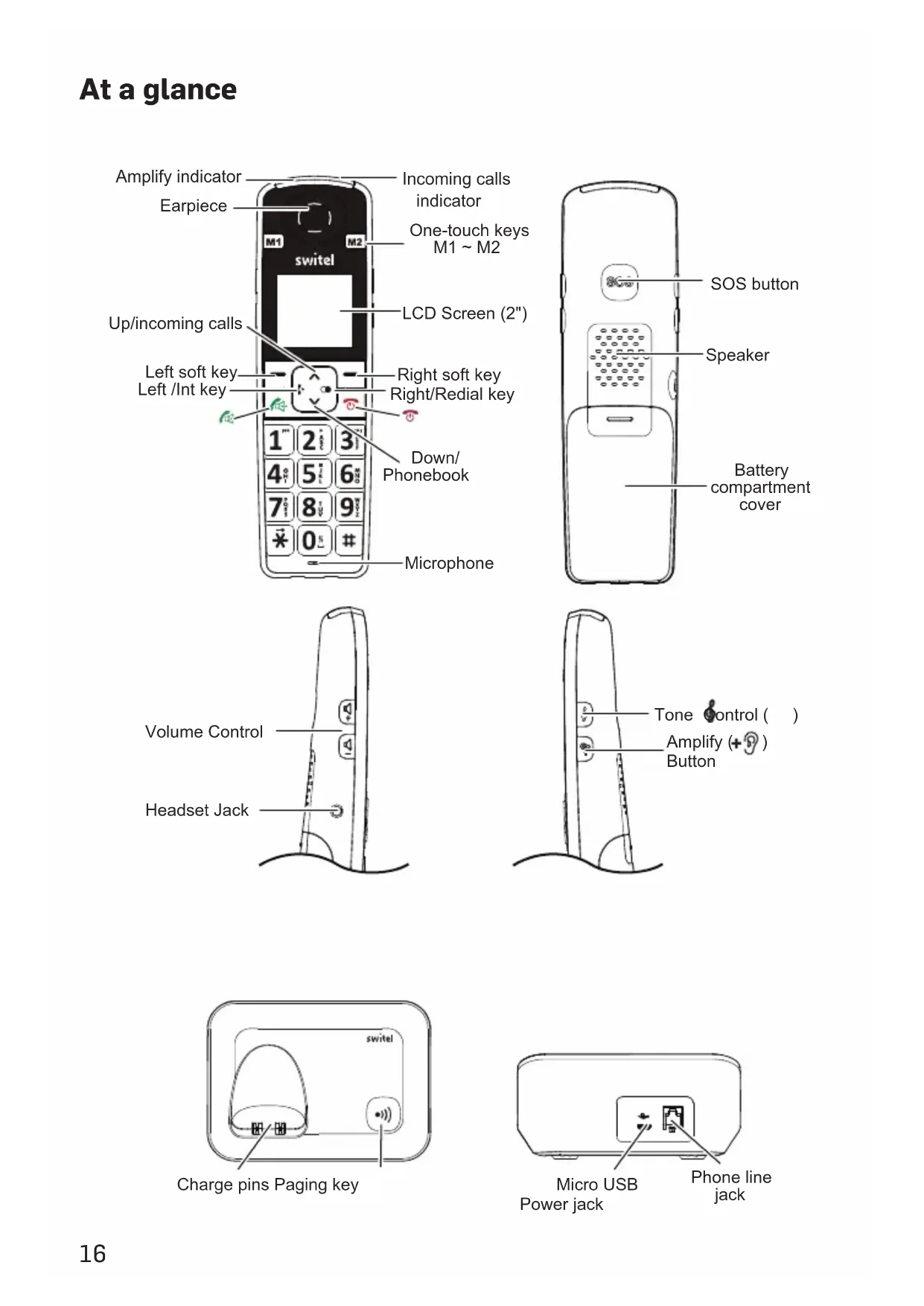 At a glance Battery compartment cover SOS button Speaker LCD Screen (2") Right soft key Up/incoming calls Down/ Phonebook One-touch keys M1 ~ M2 Left soft key Left /Int key Right/Redial key Microphone Incoming calls indicator Headset Jack Tone Control ( ) Amplify ( ) Button Volume Control Earpiece Amplify indicator Micro USB Power jack Phone line jack Charge pins Paging key17
