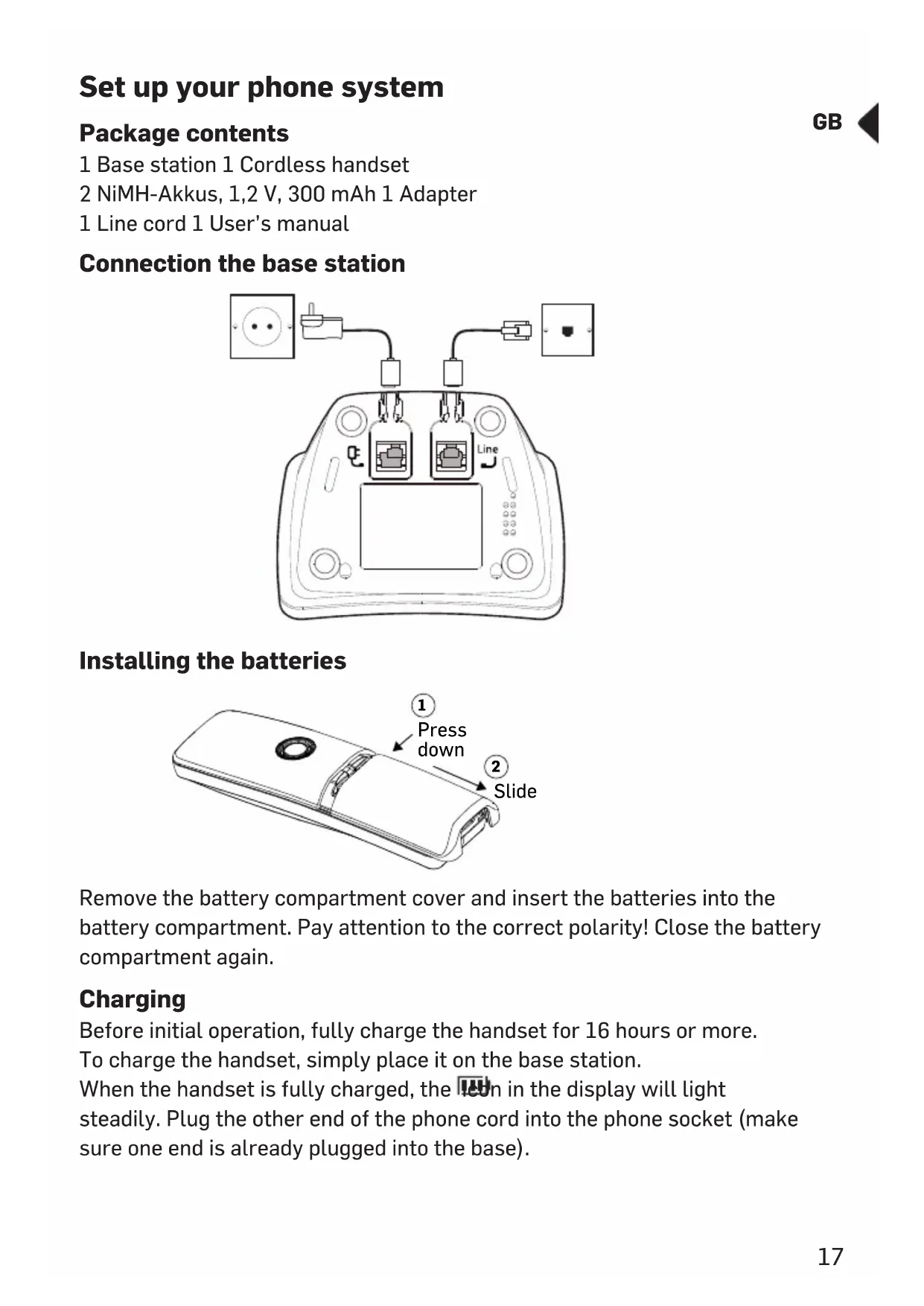 Set up your phone system Package contents 1 Base station 1 Cordless handset 2 NiMH-Akkus, 1,2 V, 300 mAh 1 Adapter 1 Line cord 1 User’s manual Connection the base station Installing the batteries Remove the battery compartment cover and insert the batteries into the battery compartment. Pay attention to the correct polarity! Close the battery compartment again. Charging Before initial operation, fully charge the handset for 16 hours or more. To charge the handset, simply place it on the base station. When the handset is fully charged, the icon in the display will light steadily. Plug the other end of the phone cord into the phone socket (make sure one end is already plugged into the base). Press down