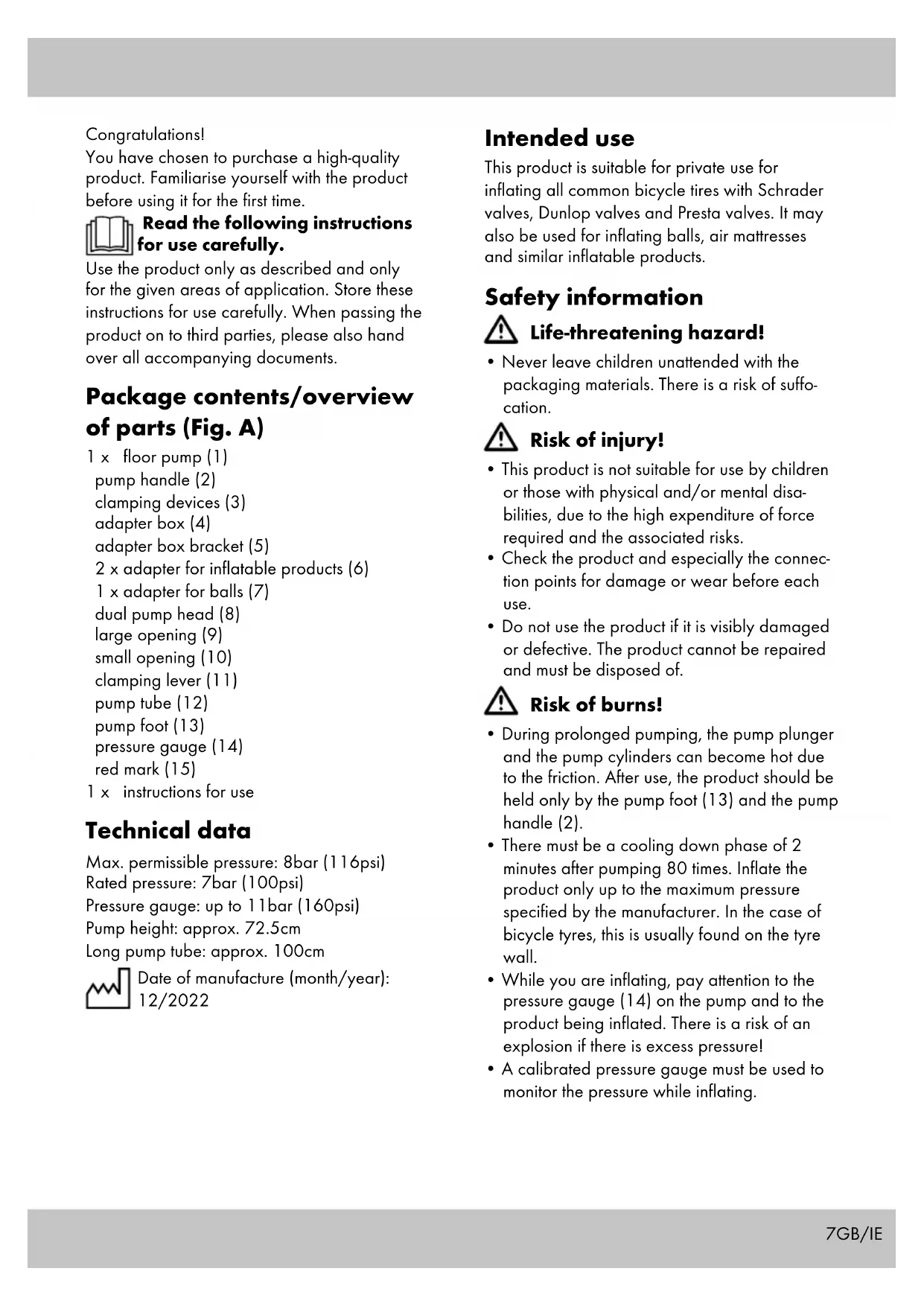 - Always stand with both feet on the pump foot (13) while pumping to prevent the product fall- ing over. There should be no kinks in the pump tube (12)! Operate the pump handle (2) with a steady action and not too fast. Selecting the adapter (Fig. B) The adapters (6/7) are located in the adapter box (4) of the product. Slide the adapter box out of the adapter box bracket (5). Open the adapt- er box and take out the required adapter. Inflating balls (Fig. C) Put the adapter for balls (7) into the large open- ing (9) of the dual pump head (8). Flip the clamping lever (11) up to lock the adapt- er in place. Then insert the adapter into the ball. Inflating inflatable products (Fig. D) Open the valve on the inflatable product. Insert the appropriate adapter for inflatable products (6) into the large opening (9) on the dual pump head (8). Flip the clamping lever (11) up to lock the adapter in place. Then insert the adapter into the valve on the inflatable product. Pumping up tyres with a Dunlop valve (Fig. E) Open the cap on the tire valve. Put the small opening (10) of the dual pump head (8) onto the valve. Flip the clamping lever (11) up to lock the adapter in place. Pumping up tires with a Schrader valve (Fig. F) Open the cap on the tire valve. Put the large opening (9) of the dual pump head (8) onto the valve. Flip the clamping lever (11) up to lock the adapter in place. Pumping up tires with a Presta valve (Fig. G) Open the cap on the tire valve. Loosen the nut on the valve. Put the small opening (10) of the dual pump head (8) onto the valve. Flip the clamping lever (11) up to lock the adapter in place. Transport (Fig. H) Lay the pump tube (12) over the pump handle (2). Clamp the pump tube into both clamping devices (3). Then you can lift the product using the pump handle and transport it. Storage, cleaning Always store the product clean and dry in a temperature-controlled room. Do not submerge the product in water, as it will get damaged! Clean with a damp cloth only and wipe dry afterwards. Apply some oil occa- sionally to the movable parts. IMPORTANT! Never clean the product with harsh cleaning agents. Disposal Dispose of the product and packaging materials in accordance with current local regulations. Store the packaging materials (foil bags, for example) out of the reach of children. For further information about disposal of the product no longer needed, contact your local council. Dispose of the product and the packaging in an environmental- ly friendly manner. The Recycling Code distinguishes different materials to be returned for recycling. The Code consists of the recycling symbol for the recycling process and a number that identifies the material.9GB/IE Notes on the guarantee and service handling The product was produced with great care and under continuous quality control. DELTA-SPORT HANDELSKONTOR GmbH gives private end customers a three-year guarantee on this product from the date of purchase (guarantee period) in accordance with the following provisions. The guarantee is only valid for material and manufacturing defects. The guarantee does not cover parts subject to normal wear and tear that are thus considered wear parts (e.g. batteries) or fragile parts such as switches, rechargeable batteries, or parts made of glass. Claims under this guarantee are excluded if the product has been used incorrectly, improperly, or contrary to the intended purpose, or if the provisions in the instructions for use were not observed, unless the end customer proves that a material or manufacturing defect exists that was not caused by one of the aforementioned circumstances. Claims under the guarantee can only be made within the guarantee period by presenting the original sales receipt. Please therefore keep the original sales receipt. The guarantee period is not extended by any repairs carried out under the guarantee, under statutory guarantees, or as a gesture of goodwill. This also applies to replaced and repaired parts. If you wish to make a claim please first contact the service hotline mentioned below or contact us by e-mail. If there is a guarantee case, then the product will be repaired or replaced free of charge to you or the purchase price will be refunded, depending on our choice. Your legal rights, in particular guarantee claims against the respective seller, are not limited by this guarantee. IAN: 409048_2207 Service Great Britain Tel.: 0800 404 7657 E-Mail: deltasport@lidl.co.uk Service Ireland Tel.: 1800 101010 E-Mail: deltasport@lidl.ie10 FR/BE Félicitations ! Vous venez d’acquérir un article de grande qualité. Avant la première utilisation, familiari- sez-vous avec l’article. Pour cela, veuillez lire attentive- ment la notice d’utilisation suivante. Utilisez l’article uniquement comme indiqué et pour les domaines d’utilisation mentionnés. Conservez bien cette notice d’utilisation. Si vous cédez l’article à un tiers, veillez à lui remettre l’ensemble de la documentation. Étendue de la livraison/ Aperçu des pièces (fig. A) 1 pompe à pied (1) poignée de la pompe (2) dispositifs de serrage (3) boîte d’adaptateurs (4) support pour la boîte d’adaptateurs (5) 2 adaptateurs pour articles gonflables (6) 1 adaptateur pour ballons (7) tête de pompe double (8) grande ouverture (9) petite ouverture (10) levier de serrage (11) tuyau de la pompe (12) pied de la pompe (13) manomètre (14) aiguille rouge (15) 1 notice d’utilisation Caractéristiques techniques Pression maximale tolérée : 8 bar (116 psi) Pression nominale : 7 bar (100 psi) Manomètre : jusqu’à 11 bar (160 psi) Hauteur de la pompe : env. 72,5 cm Longueur du tuyau de la pompe : env. 100 cm Date de fabrication (mois/année) : 12/2022 Utilisation conforme à sa destination Cet article convient à un usage privé pour le gonflage de tous les pneus de vélo courants avec valve Schrader, valve Dunlop et valve Scla- verand ainsi que pour le gonflage de ballons, matelas gonflables et autres art