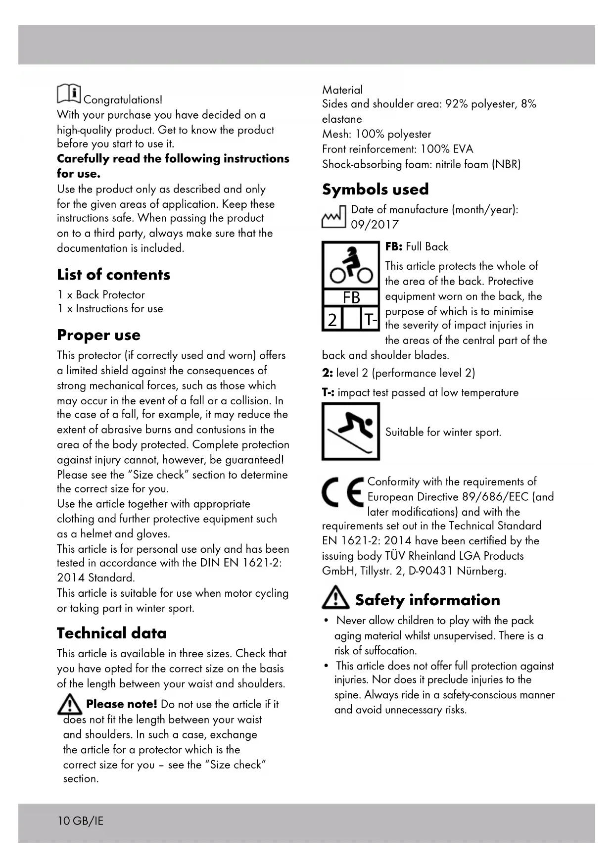 - This article does not offer full protection against injuries. Nor does it preclude injuries to the spine. Always ride in a safety-conscious manner and avoid unnecessary risks. Congratulations! With your purchase you have decided on a high-quality product. Get to know the product before you start to use it. Carefully read the following instructions for use. Use the product only as described and only for the given areas of application. Keep these instructions safe. When passing the product on to a third party, always make sure that the documentation is included. List of contents 1 x Back Protector 1 x Instructions for use Proper use This protector (if correctly used and worn) offers a limited shield against the consequences of strong mechanical forces, such as those which may occur in the event of a fall or a collision. In the case of a fall, for example, it may reduce the extent of abrasive burns and contusions in the area of the body protected. Complete protection against injury cannot, however, be guaranteed! Please see the “Size check” section to determine the correct size for you. Use the article together with appropriate clothing and further protective equipment such as a helmet and gloves. This article is for personal use only and has been tested in accordance with the DIN EN 1621-2: 2014 Standard. This article is suitable for use when motor cycling or taking part in winter sport. Technical data This article is available in three sizes. Check that you have opted for the correct size on the basis of the length between your waist and shoulders. Please note! Do not use the article if it does not fit the length between your waist and shoulders. In such a case, exchange the article for a protector which is the correct size for you – see the “Size check” section.11