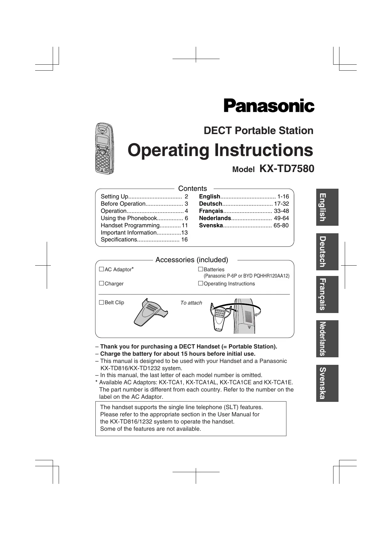 - -64 Svenska -80 Charger Operating Instructions Belt Clip To attach Svenska The handset supports the single line telephone (SLT) features. Please refer to the appropriate section in the User Manual for the KX-TD816/1232 system to operate the handset. Some of the features are not available. Nederlands – Thank you for purchasing a DECT Handset (= Portable Station). – Charge the battery for about 15 hours before initial use. – This manual is designed to be used with your Handset and a Panasonic KX-TD816/KX-TD1232 system. – In this manual, the last letter of each model number is omitted. p. 65