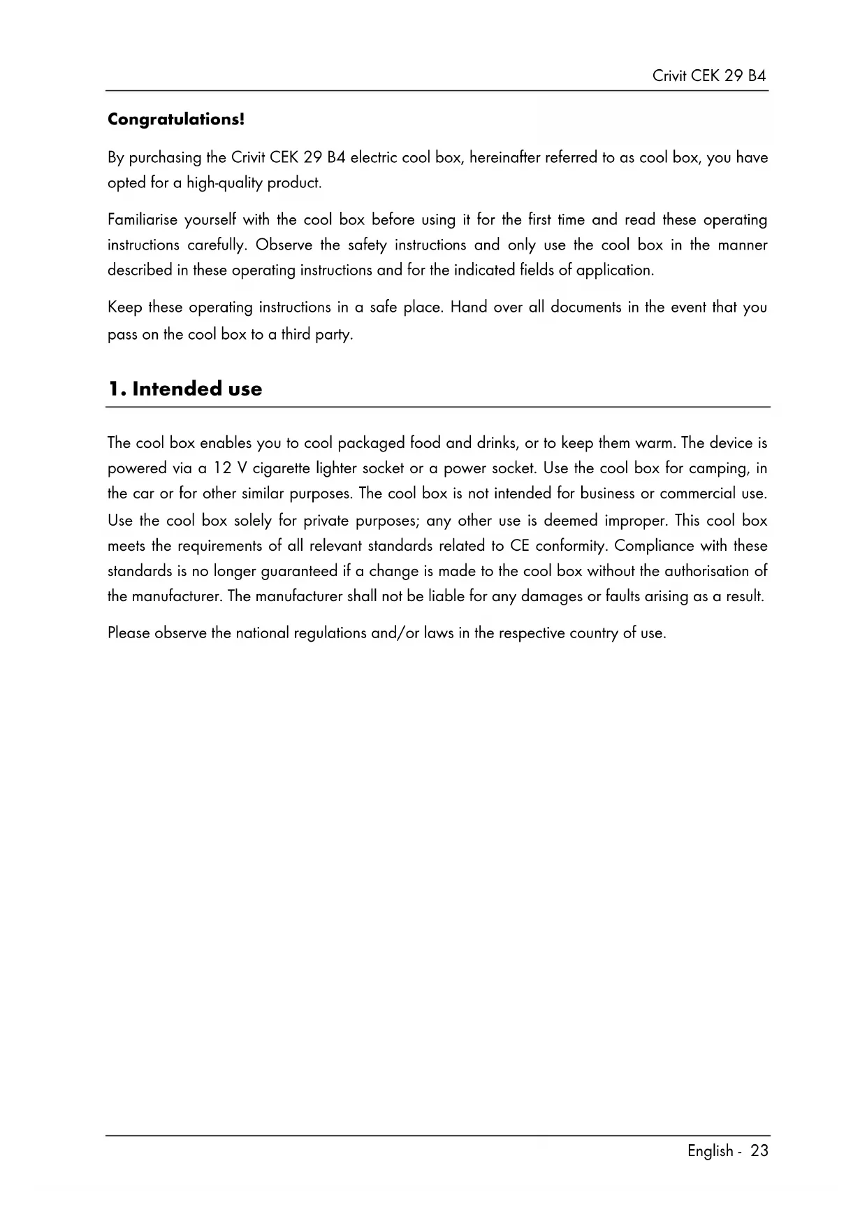 English - 23 Congratulations! By purchasing the Crivit CEK 29 B4 electric cool box, hereinafter referred to as cool box, you have opted for a high-quality product. Familiarise yourself with the cool box before using it for the first time and read these operating instructions carefully. Observe the safety instructions and only use the cool box in the manner described in these operating instructions and for the indicated fields of application. Keep these operating instructions in a safe place. Hand over all documents in the event that you pass on the cool box to a third party.