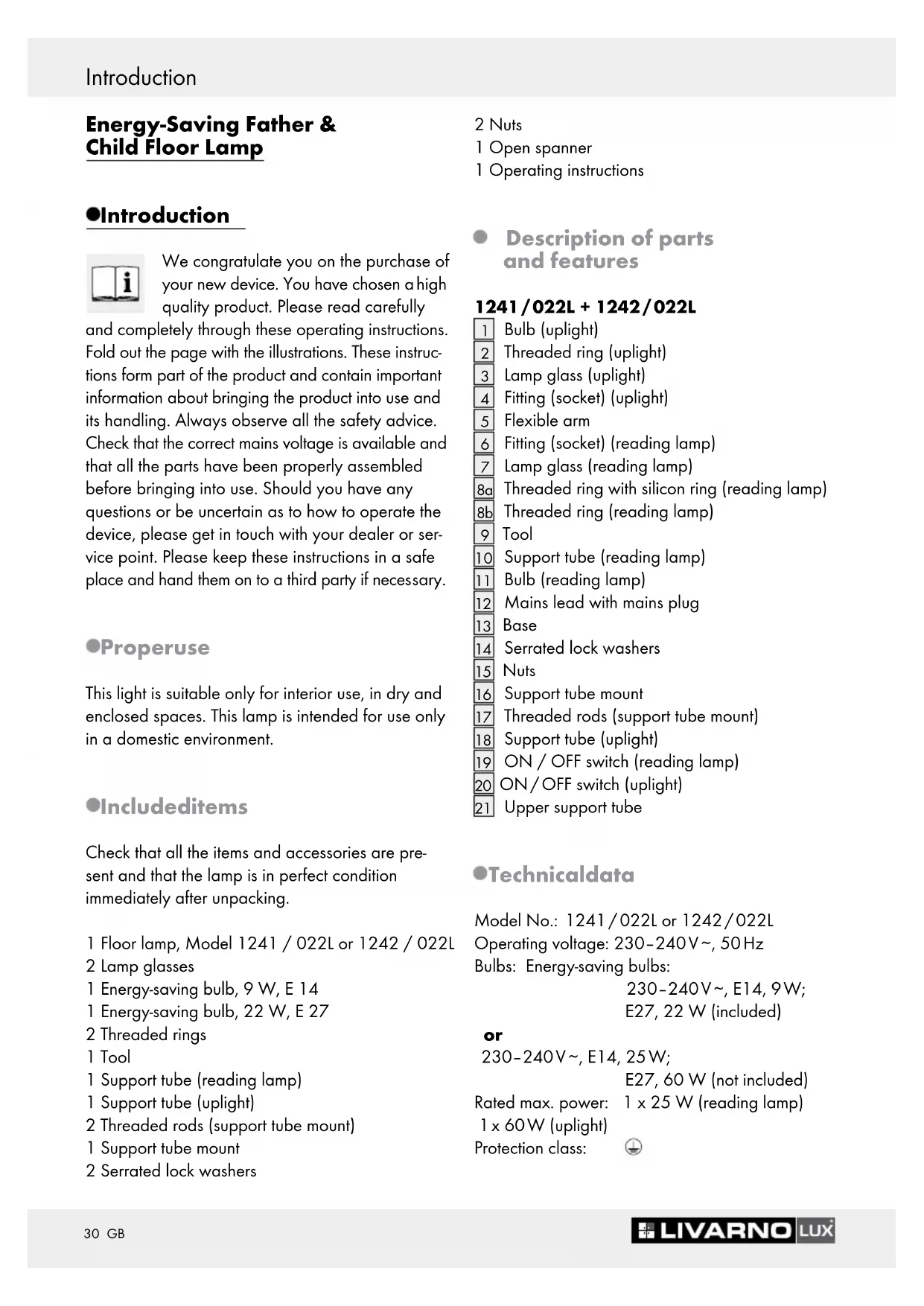 Use only 230–240 volt ∼ bulbs with an E14 fitting and a maximum power output of 25 watts for the reading lamp. Use only 230–240 volt ∼ bulbs with an E27 fitting and a maximum power output of 60 watts for the uplight. Install the light so that it is protected from moisture and dirt. Prepare carefully before assembly and allow yourself enough time. Lay out all the individual components and additional tools or materials required so that you can see and reach them. Remain alert at all times and always watch what you are doing. Always proceed with caution and do not assemble the lamp if you cannot concentrate or feel unwell.32 GB Preparing the product for use / Care and cleaning Preparing the product for use Assembling the lamp Note: You will require a second person to help with the assembly of the product. Note: Assembly is identical for both models (1241 / 022L or 1242 / 022L). Note: One threaded rod is already fitted. Note: Please ensure that you pull the cable during fitting slowly through the foot. Before installation, remove the two black plastic rings on the end of the support tube