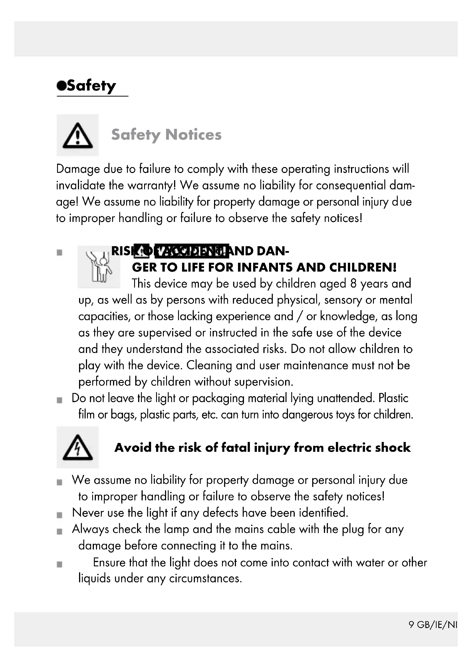 GER TO LIFE FOR INFANTS AND CHILDREN! This device may be used by children aged 8 years and up, as well as by persons with reduced physical, sensory or mental capacities, or those lacking experience and / or knowledge, as long as they are supervised or instructed in the safe use of the device and they understand the associated risks. Do not allow children to play with the device. Cleaning and user maintenance must not be performed by children without supervision. Do not leave the light or packaging material lying unattended. Plastic film or bags, plastic parts, etc. can turn into dangerous toys for children. Avoid the risk of fatal injury from electric shock We assume no liability for property damage or personal injury due to improper handling or failure to observe the safety notices! Never use the light if any defects have been identified. Always check the lamp and the mains cable with the plug for any damage before connecting it to the mains. Ensure that the light does not come into contact with water or other liquids under any circumstances.10 GB/IE/NI Never open any of the components of the electrical equipment or insert any objects into the same components. This will pose a risk of fatal injury from electric shock. Touch only the insulated part of the plug when connecting to or disconnecting from the mains supply! To prevent hazards, if the external flexible lead on this lamp is damaged it must be replaced by the manufacturer, its service representative or an equally qualified professional! Before use, verify the available mains voltage matches the voltage required for operating the light (220–240 V