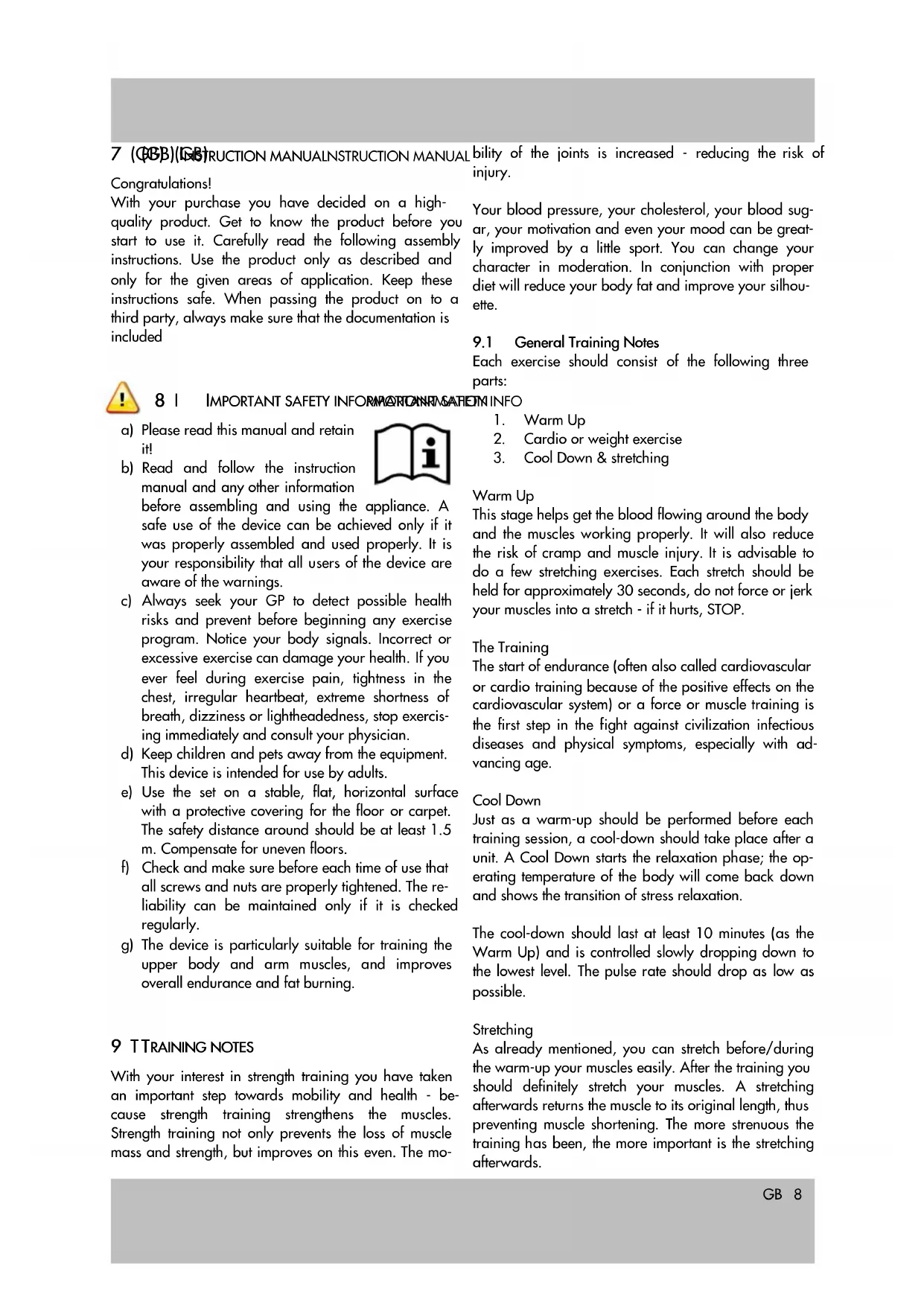 a) Please read this manual and retain it! b) Read and follow the instruction manual and any other information before assembling and using the appliance. A safe use of the device can be achieved only if it was properly assembled and used properly. It is your responsibility that all users of the device are aware of the warnings. c) Always seek your GP to detect possible health risks and prevent before beginning any exercise program. Notice your body signals. Incorrect or excessive exercise can damage your health. If you ever feel during exercise pain, tightness in the chest, irregular heartbeat, extreme shortness of breath, dizziness or lightheadedness, stop exercis- ing immediately and consult your physician. d) Keep children and pets away from the equipment. This device is intended for use by adults. e) Use the set on a stable, flat, horizontal surface with a protective covering for the floor or carpet. The safety distance around should be at least 1.5 m. Compensate for uneven floors. f) Check and make sure before each time of use that all screws and nuts are properly tightened. The re- liability can be maintained only if it is checked regularly. g) The device is particularly suitable for training the upper body and arm muscles, and improves overall endurance and fat burning.
