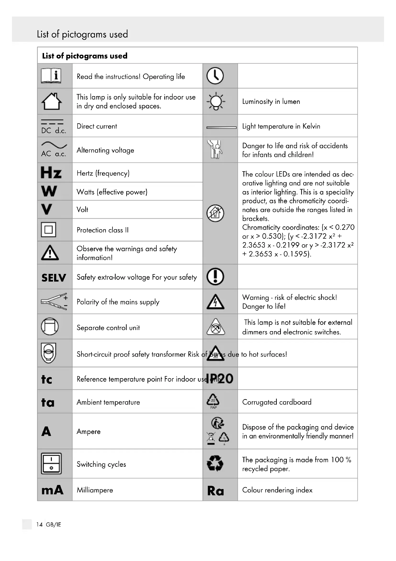 Colour rendering index Introduction15 GB/IE List of pictograms used Introduction Smart LED under-cabinet lighting Introduction Congratulations on your new product. You have selected a high quality product. Please be sure to carefully read the com- plete operating instructions. These instructions are part of the product and contain important information on setup and handling. Always follow all safety in- structions. Before using this product for the first time verify the correct voltage and that all parts are prop- erly installed. Should you have any questions or you are unsure about operating the product, please con- tact the dealer or service centre. Please keep these instructions in a safe place and pass them on to third parties as applicable. Intended use This light is only suitable for indoor use in dry and enclosed spaces. This light is only intended for private residential use, not for commercial use. Any use other than that de- scribed above is prohibited and will result in product damage. This is further associated with dangers, e.g. short-circuit, fire, electric shock, etc. This product is intended for normal operation. The colour LEDs are intended as decora- tive lighting and are not suitable as inte- rior lighting. This is a specialist product, as the chromaticity values lie outside of the ranges stated in brackets. Chromaticity coordinates: (x < 0.270 or x > 0.530); (y < -2.3172 x² + 2.3653 x - 0.2199 or y > -2.3172 x² + 2.3653 x - 0.1595). Scope of delivery Check that all the parts are present and that the device is in perfect condition immediately after unpacking. 1 LED light strip, 14149505L / 14149506L 2 wall plugs 2 screws 1 set of installation instructions and instructions for use Parts description