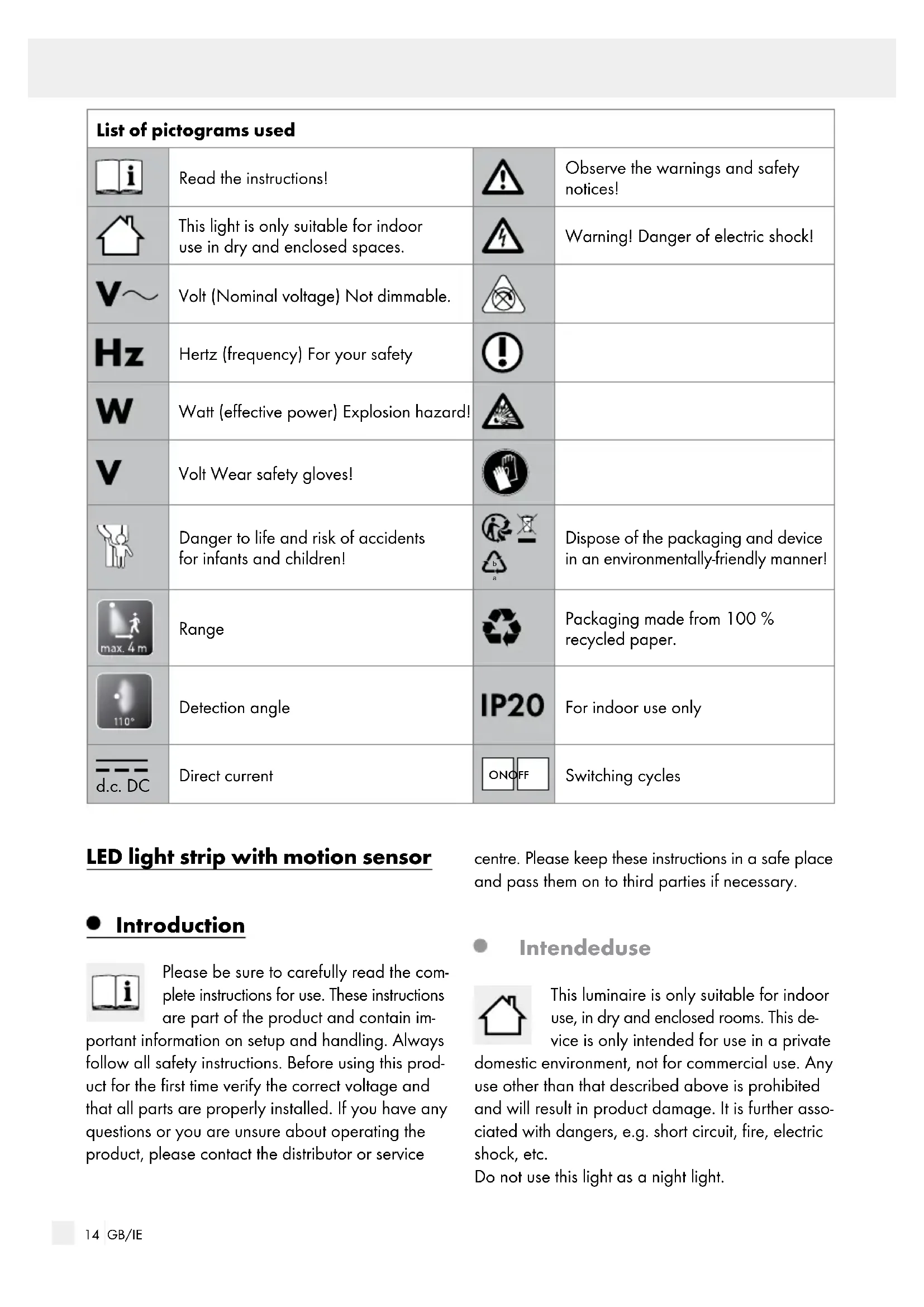 Dispose of the packaging and device in an environmentally-friendly manner! Range Packaging made from 100 % recycled paper. Detection angle For indoor use only d.c. DC Direct current ON OFF Switching cycles LED light strip with motion sensor Introduction Please be sure to carefully read the com- plete instructions for use. These instructions are part of the product and contain im- portant information on setup and handling. Always follow all safety instructions. Before using this prod- uct for the first time verify the correct voltage and that all parts are properly installed. If you have any questions or you are unsure about operating the product, please contact the distributor or service centre. Please keep these instructions in a safe place and pass them on to third parties if necessary. Intended use This luminaire is only suitable for indoor use, in dry and enclosed rooms. This de- vice is only intended for use in a private domestic environment, not for commercial use. Any use other than that described above is prohibited and will result in product damage. It is further asso- ciated with dangers, e.g. short circuit, fire, electric shock, etc. Do not use this light as a night light.15 GB/IE Introduction / SafetyIntroduction Scope of delivery Check immediately after unpacking that the parts are complete and that the product is in proper condition. 1 LED rope light 1 adhesive strip 4 batteries 1.5 V AAA 1 set of instructions for use Parts description