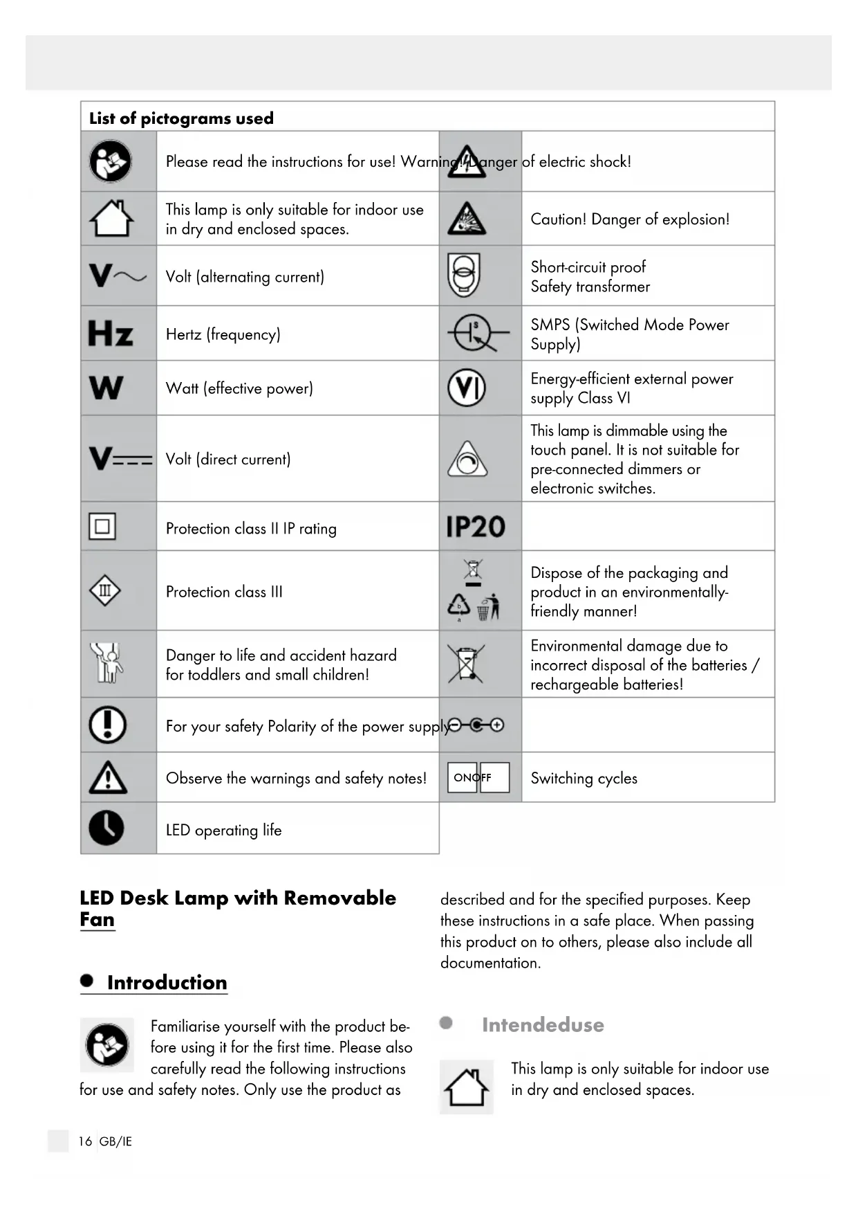 Dispose of the packaging and product in an environmentally- friendly manner! Danger to life and accident hazard for toddlers and small children! Environmental damage due to incorrect disposal of the batteries / rechargeable batteries! For your safety Polarity of the power supply Observe the warnings and safety notes! ON OFF Switching cycles LED operating life LED Desk Lamp with Removable Fan Introduction Familiarise yourself with the product be- fore using it for the first time. Please also carefully read the following instructions for use and safety notes. Only use the product as described and for the specified purposes. Keep these instructions in a safe place. When passing this product on to others, please also include all documentation. Intended use This lamp is only suitable for indoor use in dry and enclosed spaces.17 GB/IE Only use the lamp as described in these instructions for use. Any other use is considered improper use and may result in property damage and / or personal injury. The lamp is not a toy. The manufacturer and retailer assume no liability for damages due to im- proper or incorrect use. Scope of delivery 1 LED desk lamp with removable fan, model 55399 1 Mains adapter 1 Micro-USB cable 1 Set of instructions for use Parts description