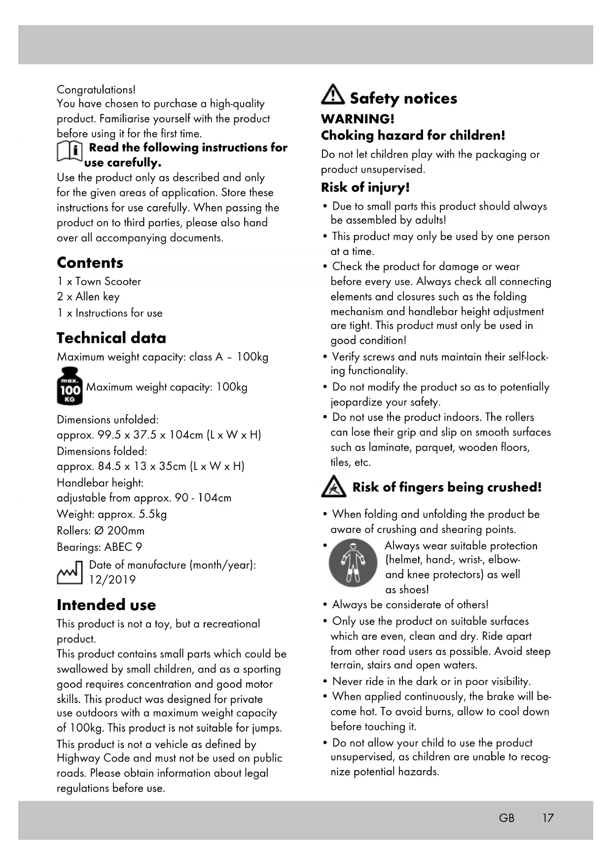Download the instructions for your Electric scooter in PDF format for free! Find your manual IAN 327355 - CRIVIT and take your electronic device back in hand. On this page are published all the documents necessary for the use of your device. IAN 327355 by CRIVIT.